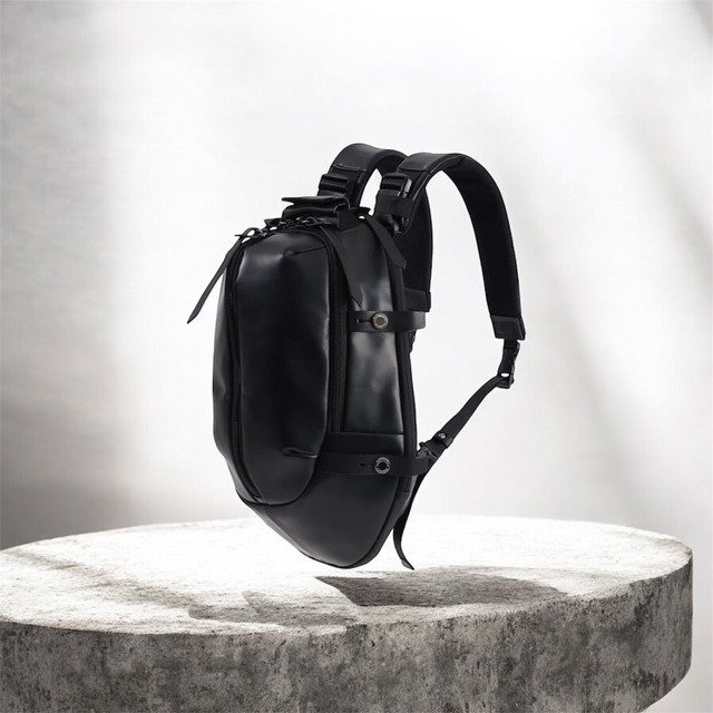 王道のレザーバックパックが気軽に使えるボディバッグに変身 ブランドのアイコニックである DENSITY MANIA PACK-1 。「使ってみたいけれどバックパックまでの容量は必要ないなぁ」と迷われていた方へ。他の誰とも被らないボディバッグを探している方へお勧めです。 個性のあるデザインは小振りなサイズ感であれば、全身のコーディネートに気を配らずに気軽に使えます。ボディバッグはショルダーバッグに比べて全身のコーディネートのバランスが取り易いのもメリットです。 バッグ本体には半艶に仕上げた国産の牛革を使用し、独創的なシルエットを力強い表情に見せてくれます。 モード、カジュアル、ストリートと、様々なコーディネートに合わせられます。 必要な機能をシンプルに 前面ファスナーの中は折り畳み傘、ドリンクボトルが収納できるサイズです。パスケース、スマートフォンなどの小物を収納するメッシュのポケットが付いています。 両開きのファスナーを開いた本体は10.5インチまでの i-Pad が入るサイズ感で、背面側に小分けができるポケットが付いています。 レザーアイテムながら軽量で、ショルダーは厚み1cmの反撥性のあるクッション材を入れているので肩と背中に負荷がかかりません。 製品仕様 サイズ: 16 × 36 × 17.5 cm ( 横幅 × 高さ × マチ) ・ショルダーの長さ: 最短 67〜最長 113cm ( バッグ上部付根から底部の金具を含む長さ) ・肩当てパーツ: 47.5 × 7× 1 cm ( 長さ × 横幅 × 厚み) ・外装素材: 牛革 ・内装素材: ナイロン ・ショルダー肩当て部には 反撥性の厚み1cmのクッション材を使用 ・生産国: JAPAN ・重量: 約 465 g