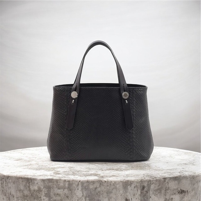 高級素材のダイヤモンドパイソンで上品にスパイスを。収納力を備えた丁度よいサイズ感のミニトートバッグ ハンドル部分の金具が特徴的で、本体にダイヤモンドパイソンを使用した高級素材ミニトートバッグ カジュアルにも綺麗目な洋服にも合わせ易いミニマルなデザインです 付属のショルダーパーツを付けると、斜めがけ・肩掛けができるので、洋服のシルエットに合わせて持ち方を替えられます サイズ: (天巾) 31/ (底巾) 30 × 22.5 × 10 cm ( 横幅×高さ×マチ幅 ) 付属ショルダー長さ: 最短 74 〜 最長132 cm ( 金具を含む長さ) ハンドルの高さ(手を通す部分): 14cm 外装素材: 蛇革、牛革 内装素材: ナイロン 生産国: JAPAN 重量: 約653 g 商品番号: KK-260-P バッグ本体にはインドネシア産のダイヤモンドパイソンを使用。程よい大きさの鱗が綺麗に並ぶパイソンです 黒に染色されているので伝わらないと思いますが、ダイヤモンドパイソンはダイヤモンド柄の幾何学模様が綺麗に入っており、天然の美しさがみられる素材です 蛇革は弱い素材というイメージを持つ方もいらっしゃるようですが、水と陸で生きる生き物なので強い方だと思います。ただ、革の厚みが0.6mm程と薄いので、蛇革の裏には引き裂き強度を高める為に、芯を当て強度をつけています。強度面は心配なくご使用いただけます
