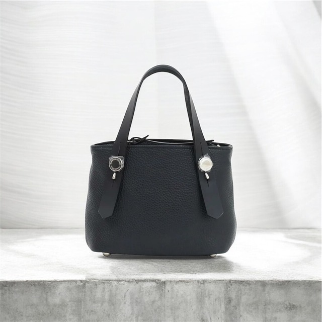 定番化したなプチトートでバランスのよいコーディネートを ハンドル部分の金具が特徴的なプチサイズのレザートートバッグです スマートフォン、お財布、パスケース、文庫本など、最低限の荷物を持ち運べる容量です( 横幅がある長財布は入らない場合があります。 バッグのサイズが小さいと意外にもコーディネトのバランスが取り易く、 様々なテイストやシルエットで楽しんでいただきたいアイテムです 小さいながら変わらぬ本格的な仕様 バッグ本体には、程よい張り感としなやかさがあるイタリア製の牛革を使用し、高級感を感じる素材です 小振りなバッグなので内装はシンプルに、小分けができるポケットを付けています。小さいながらファスナーでバッグの中身を隠せるのも嬉しいポイントです ※レディース着用画像はサイズ感のイメージです。 製品仕様 サイズ: H 16 W 21 (天巾) 20(底巾) D 10 cm 付属ショルダー長さ: 最短 74 〜 最長132 cm ( 金具を含む長さ) ハンドルの高さ(手を通す部分): 11cm 外装素材: 牛革 内装素材: ナイロン 生産国: JAPAN 重量: 約470 g HSCODE: 42029100 商品番号: KK-266-C カラー: BLACK
