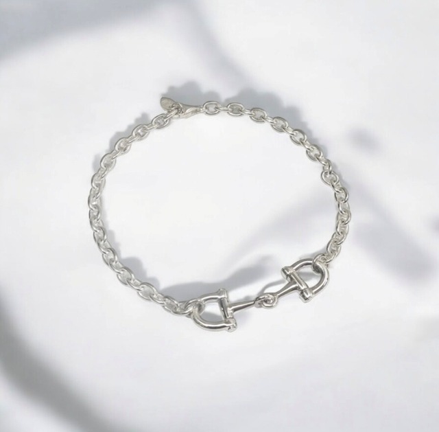 Horse Bit Bracelet BR1270 Horse Bit Bracelet シングルジョイントのビットにDリングのビットリングでまとめた洗練されたホースビットブレスレット。馬具本来の質実剛健な作りはしっかりと再現しつつも、スタイリッシュモダンに仕上げています。 HISASHI様(GLAY)着用モデル 素材 SILVER950 サイズ モチーフ/縦:10.5mm 横:32mm M:17.5cm/L:19.5mm