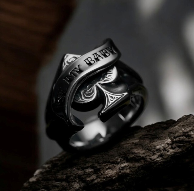 R-786- トライバル柄を彫ったスペードに立体的にリボンが絡むRING。 リング本体とリボンを別パーツで構成する事で、より立体的で奥行きのあるデザインに。 リボンにはメッセージ「BE MY BABY」が刻まれている。 HISASHI(GLAY)着用モデル 素材 SILVER950 サイズ リング幅:17mm