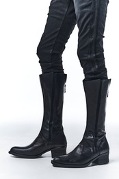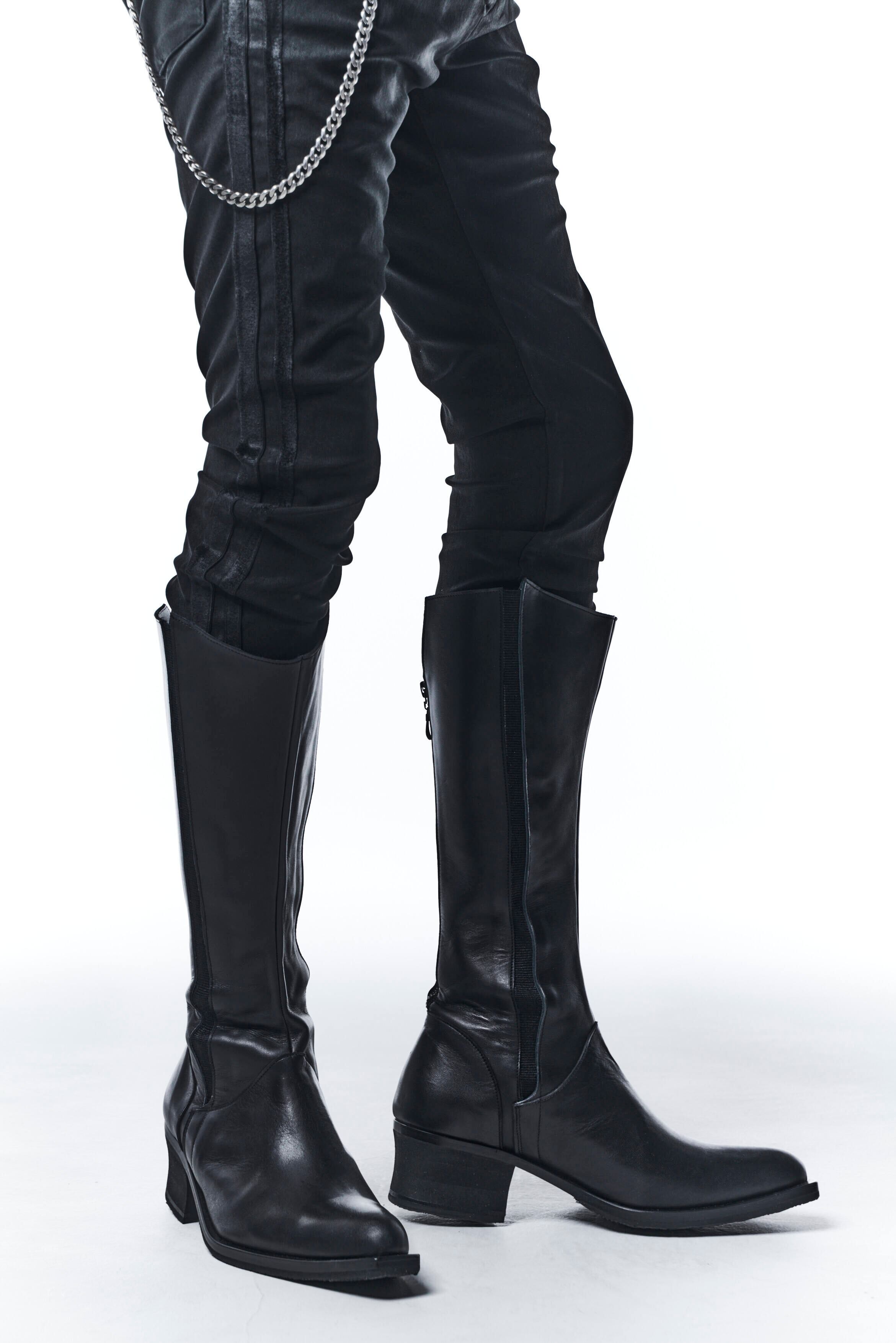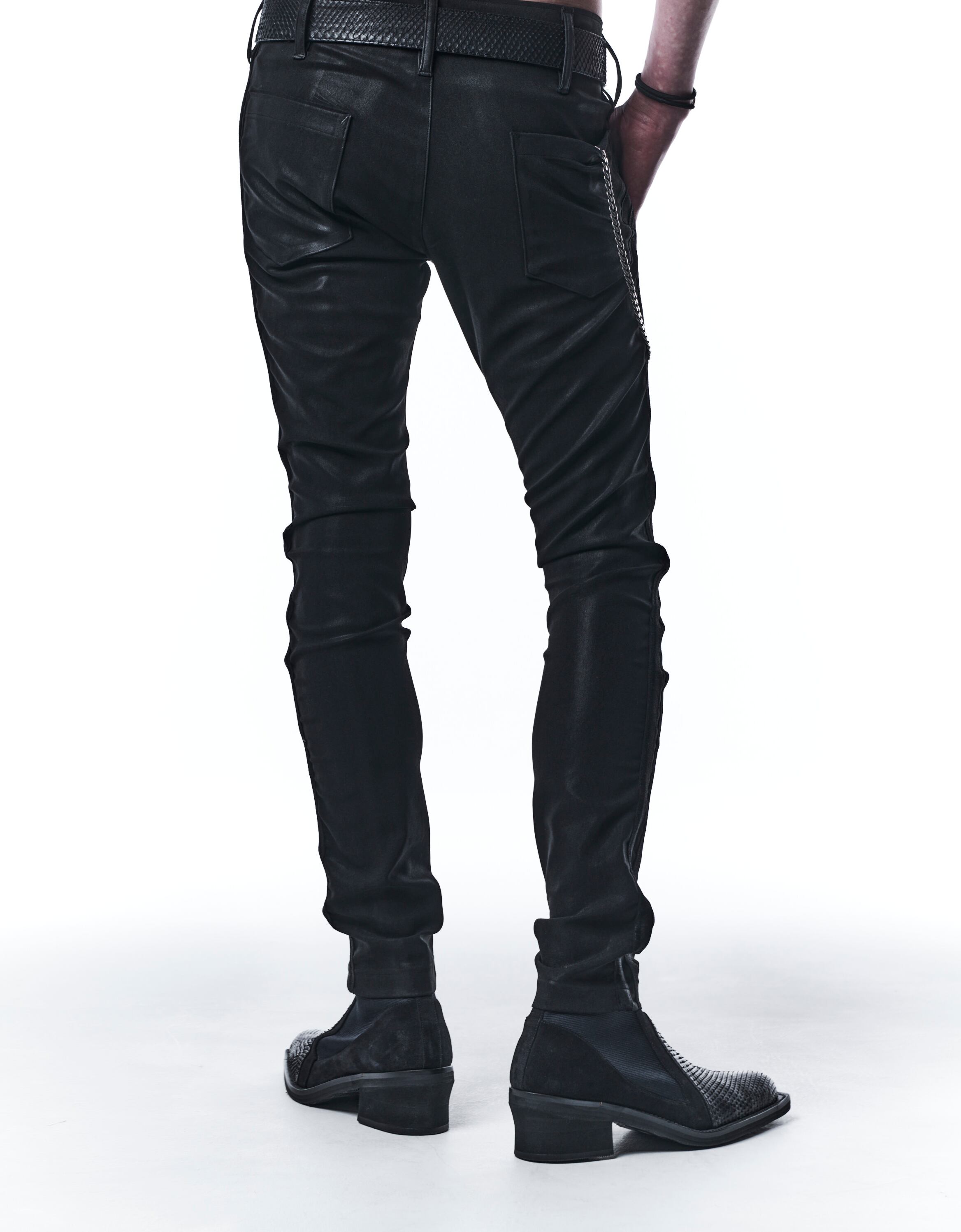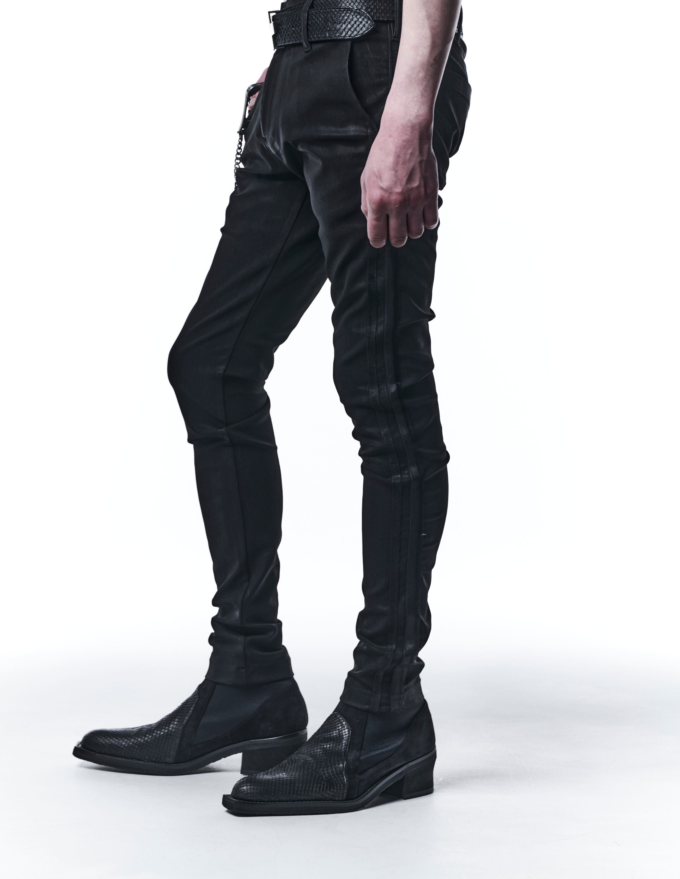 脇にベルベットテープをあしらったコーティングスキニーパンツ。