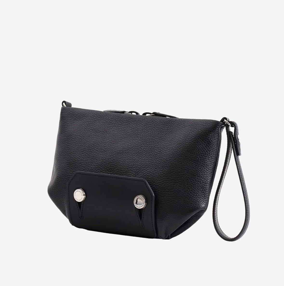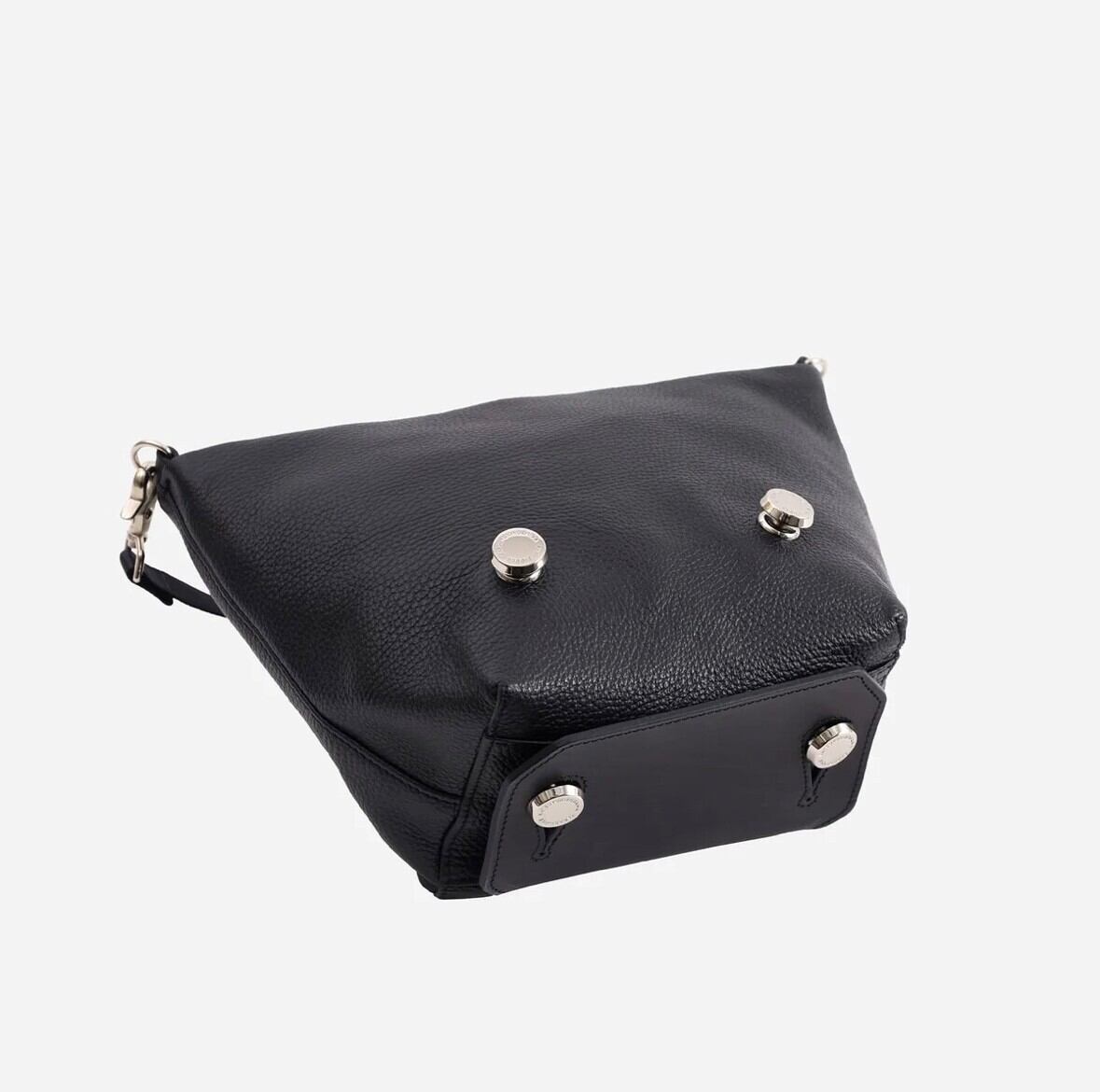 バッグの下方の釦を付け替えるとバッグのサイズが変えられ、脱着可能な付属のショルダーとハンドルでショルダーバッグとして、クラッチバッグとして、1つで使い方が選べる欲張りなアイテムです