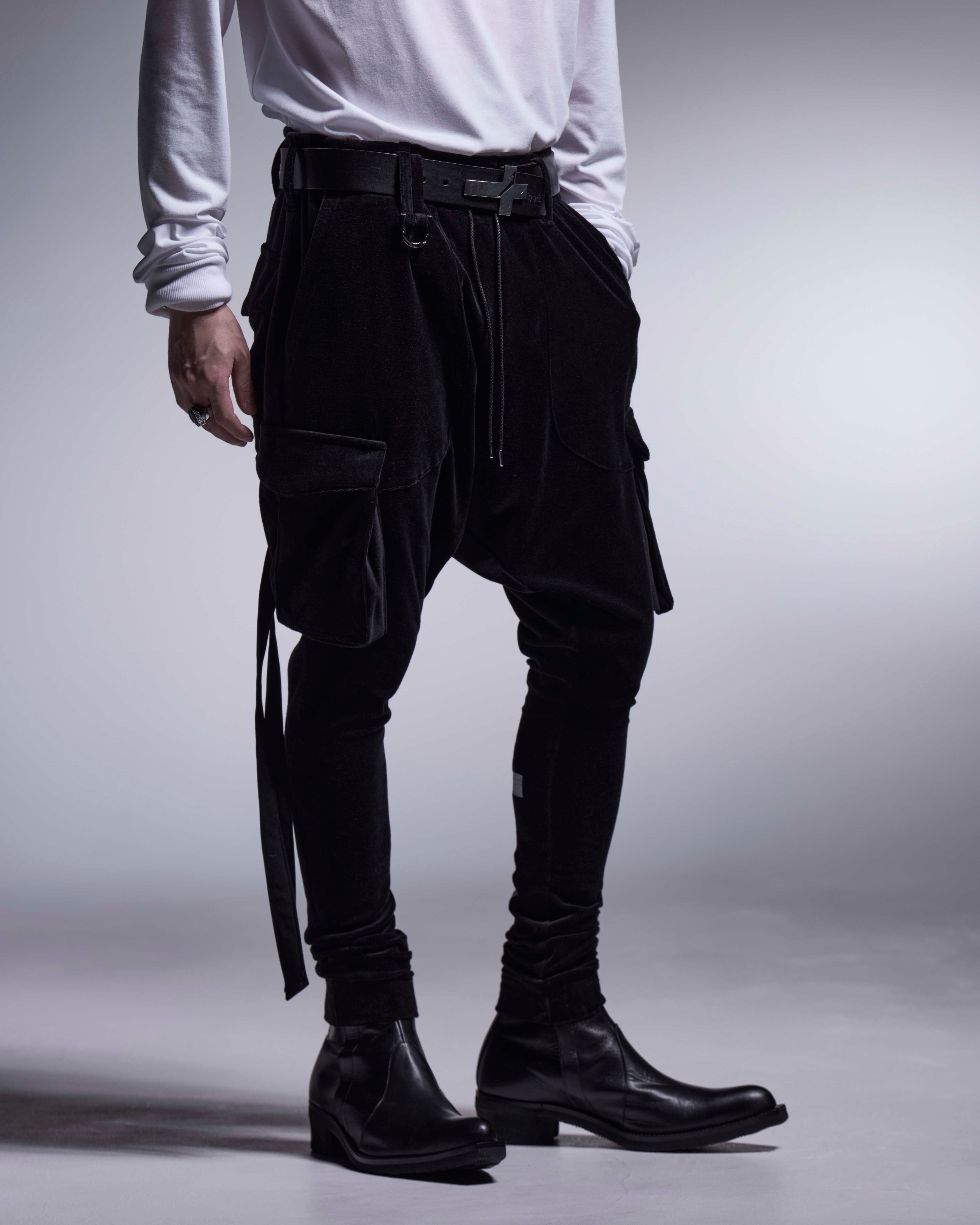 垂れ下がった脇アウトポケットのベルトは収納可能。