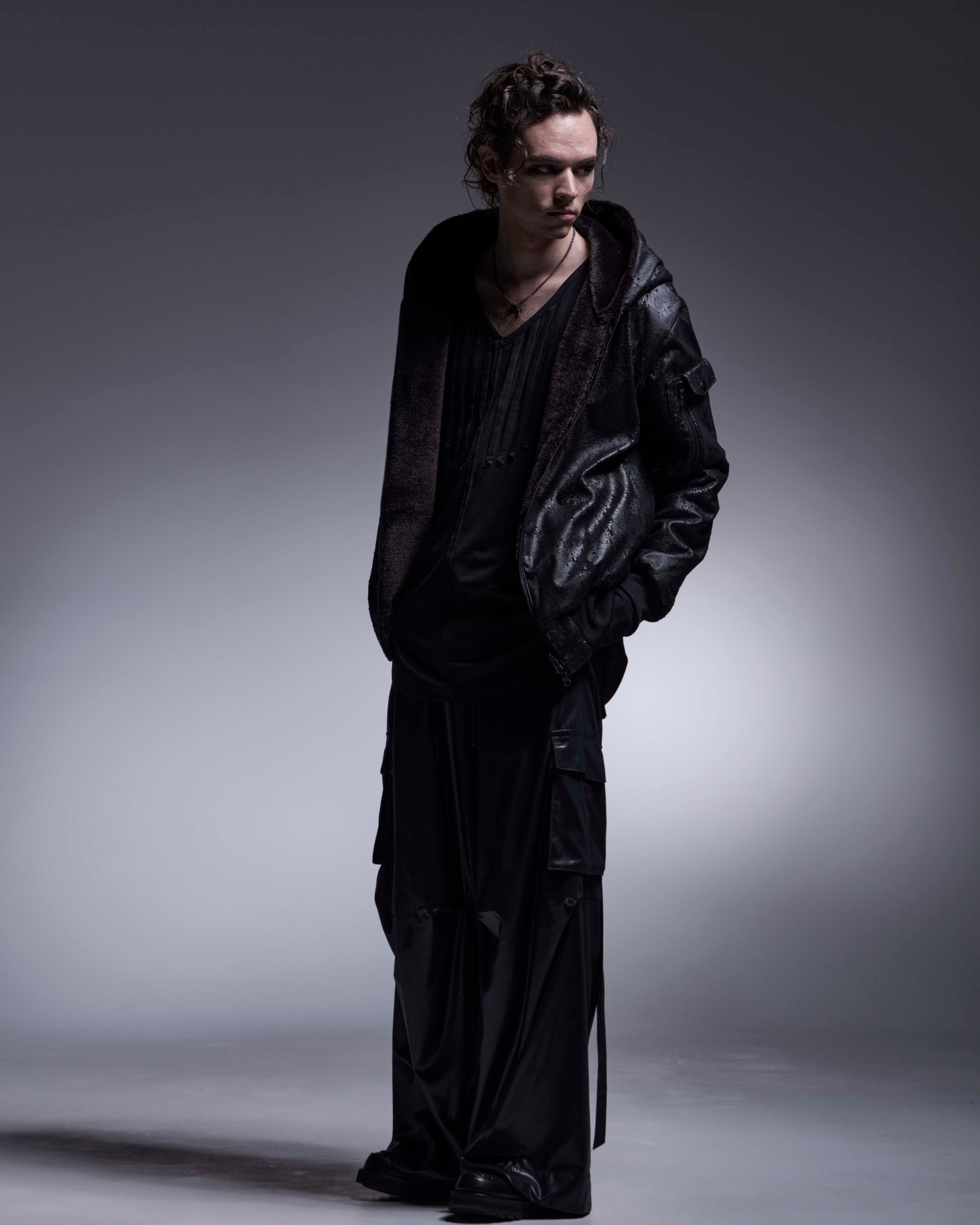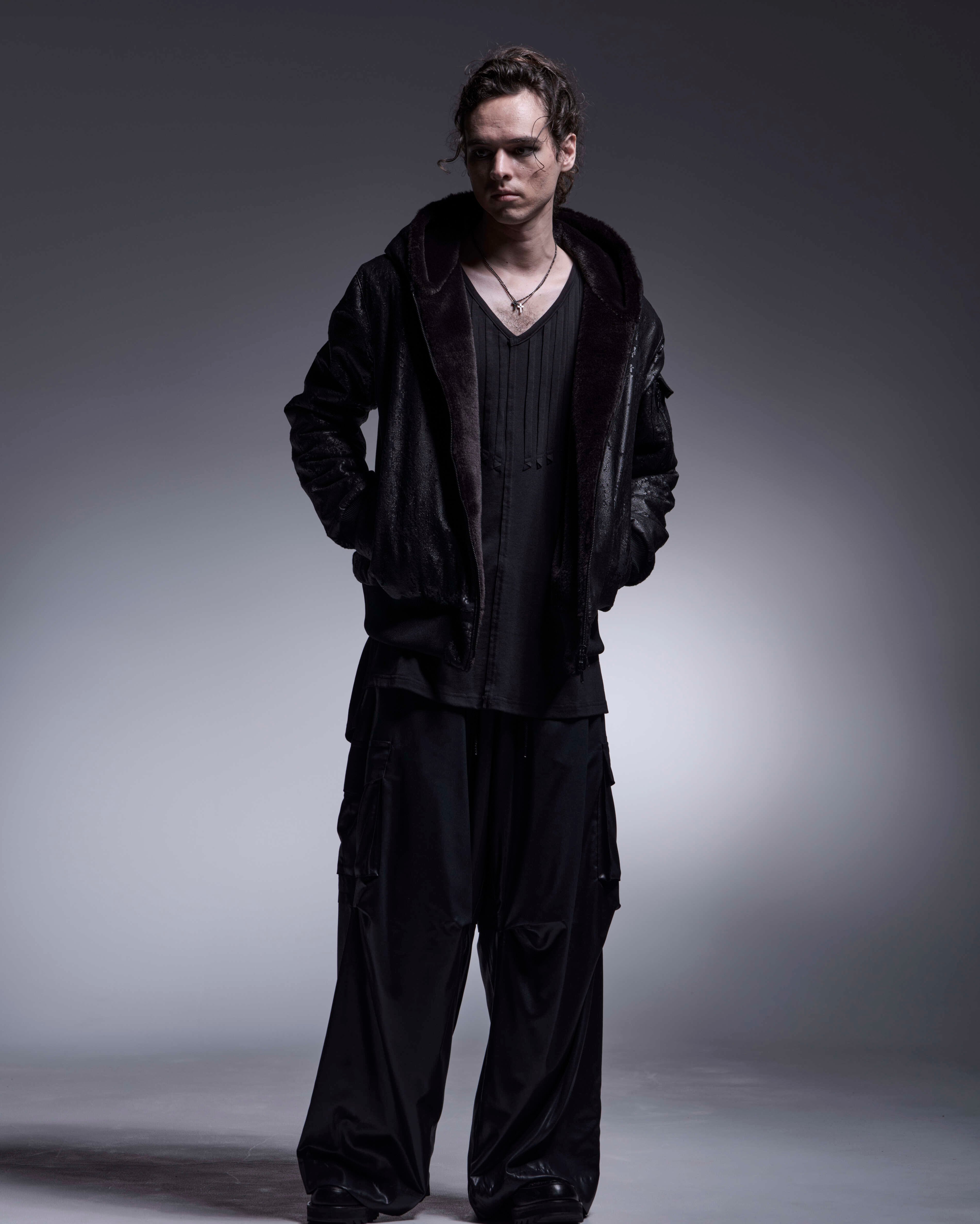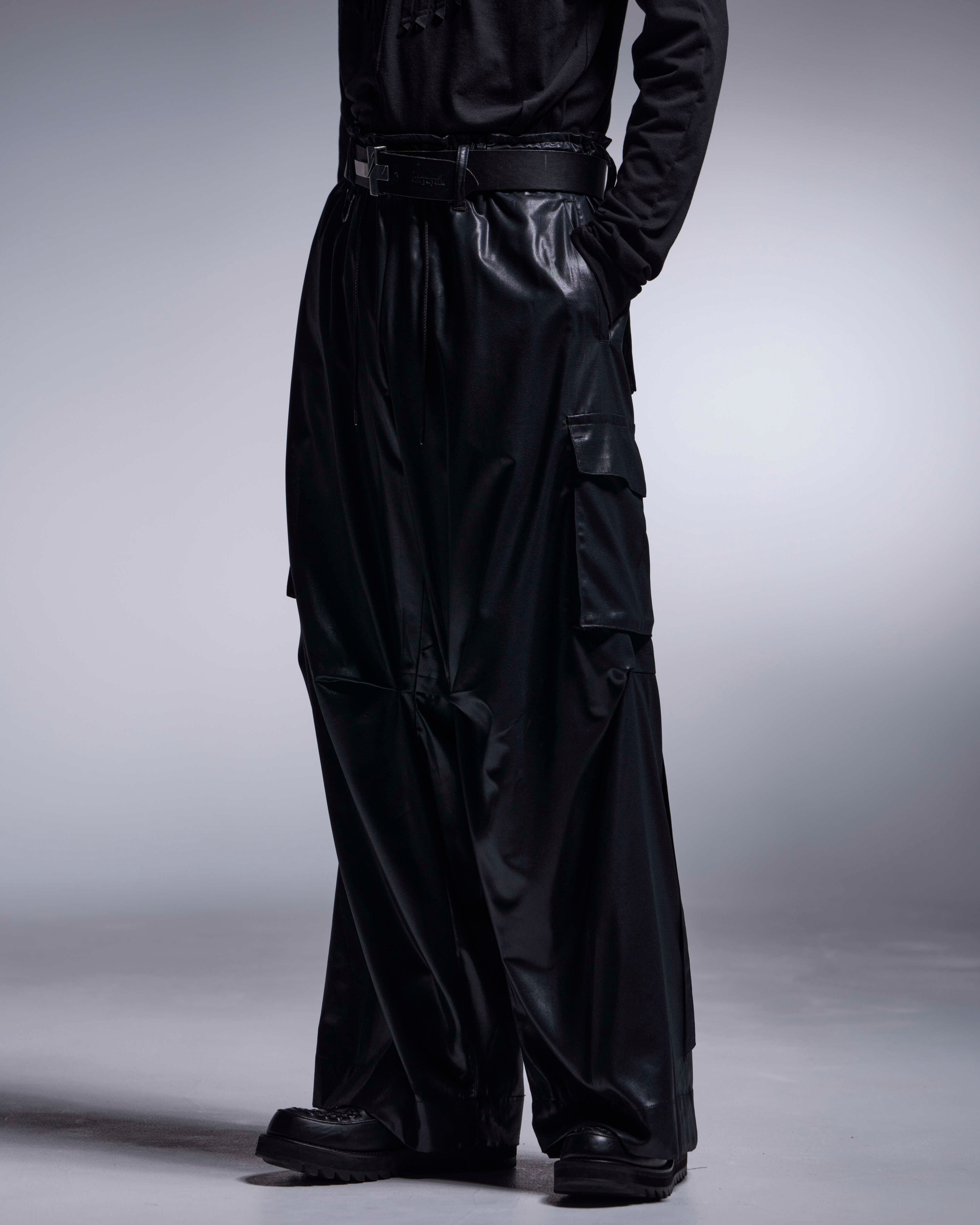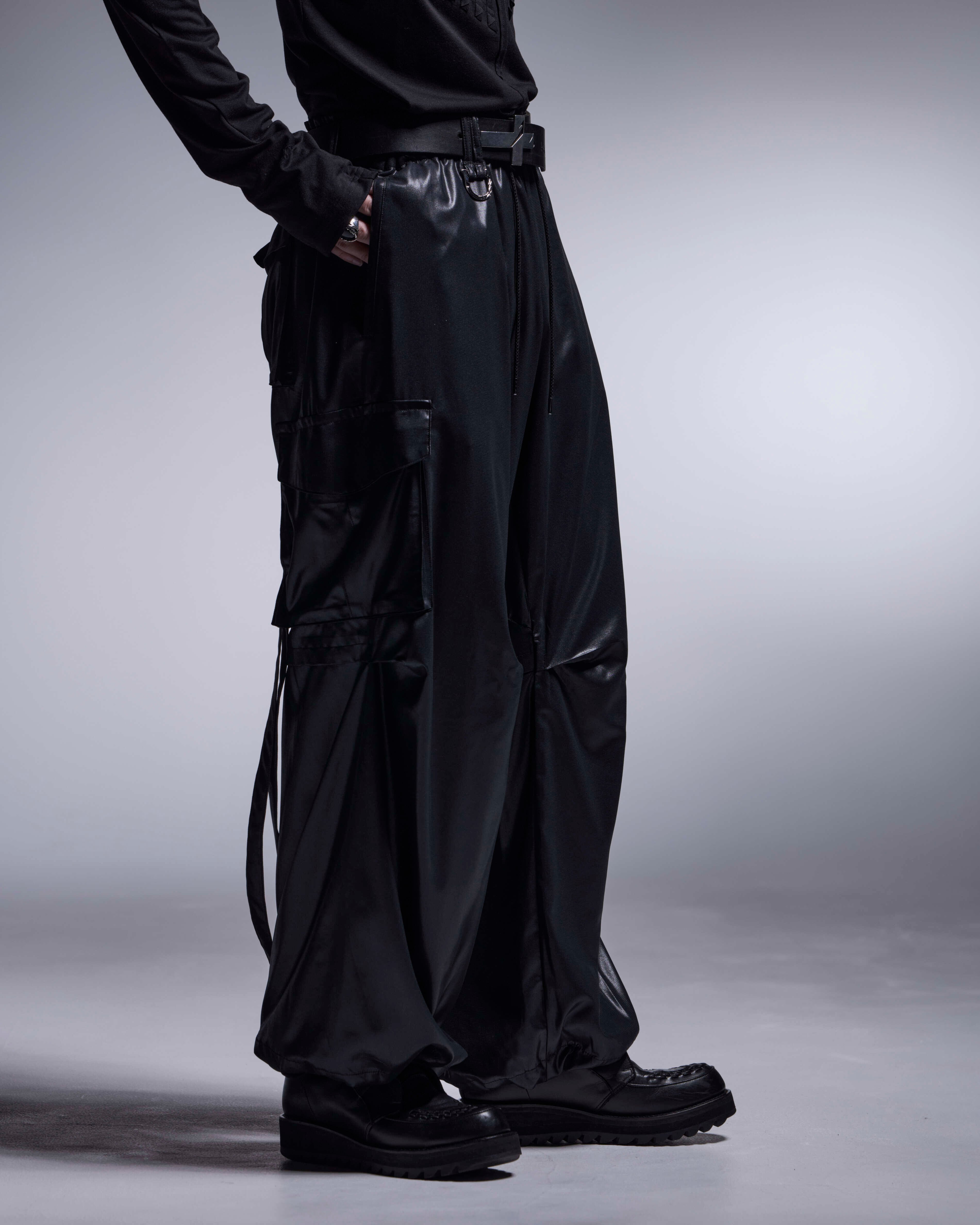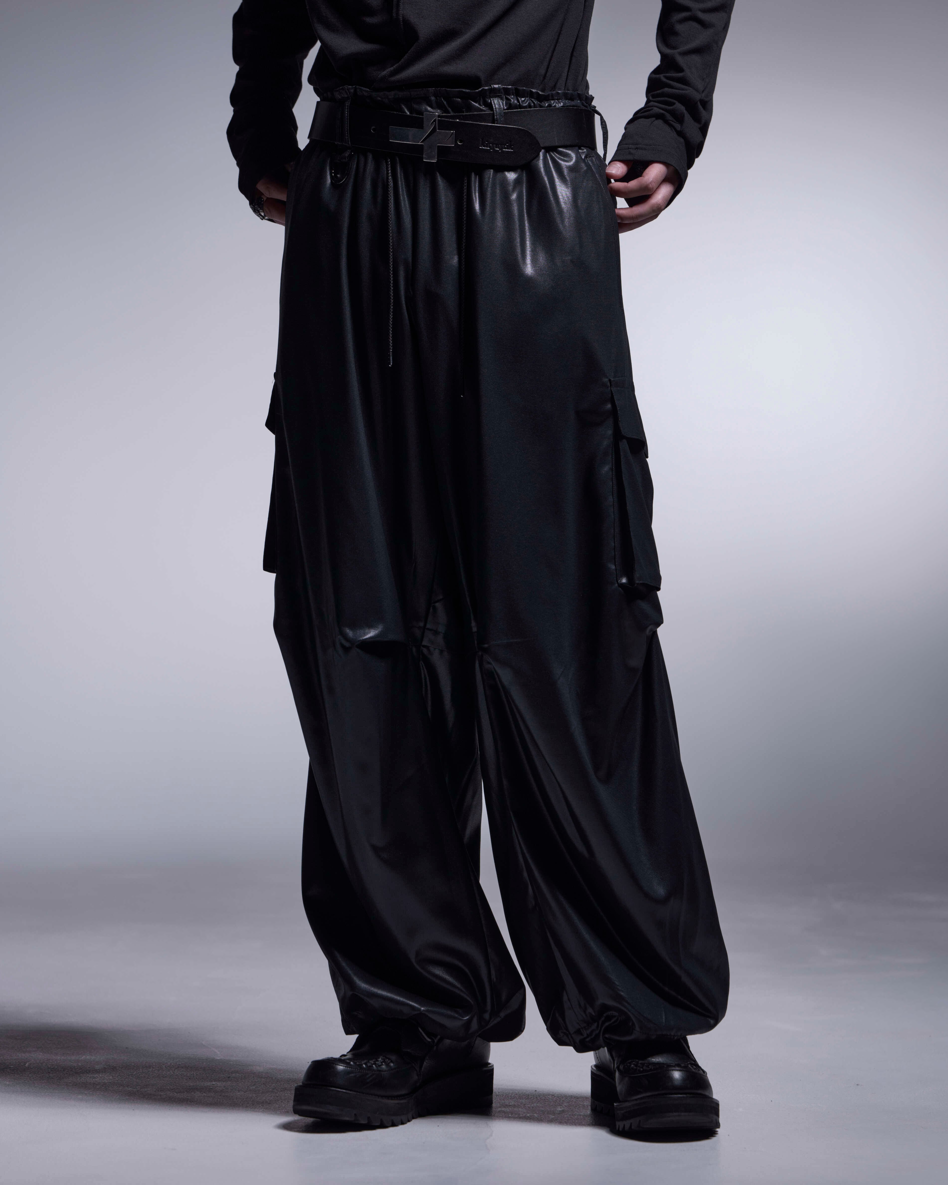 ウエストゴム仕様 紐付きのワイドカーゴパンツ。