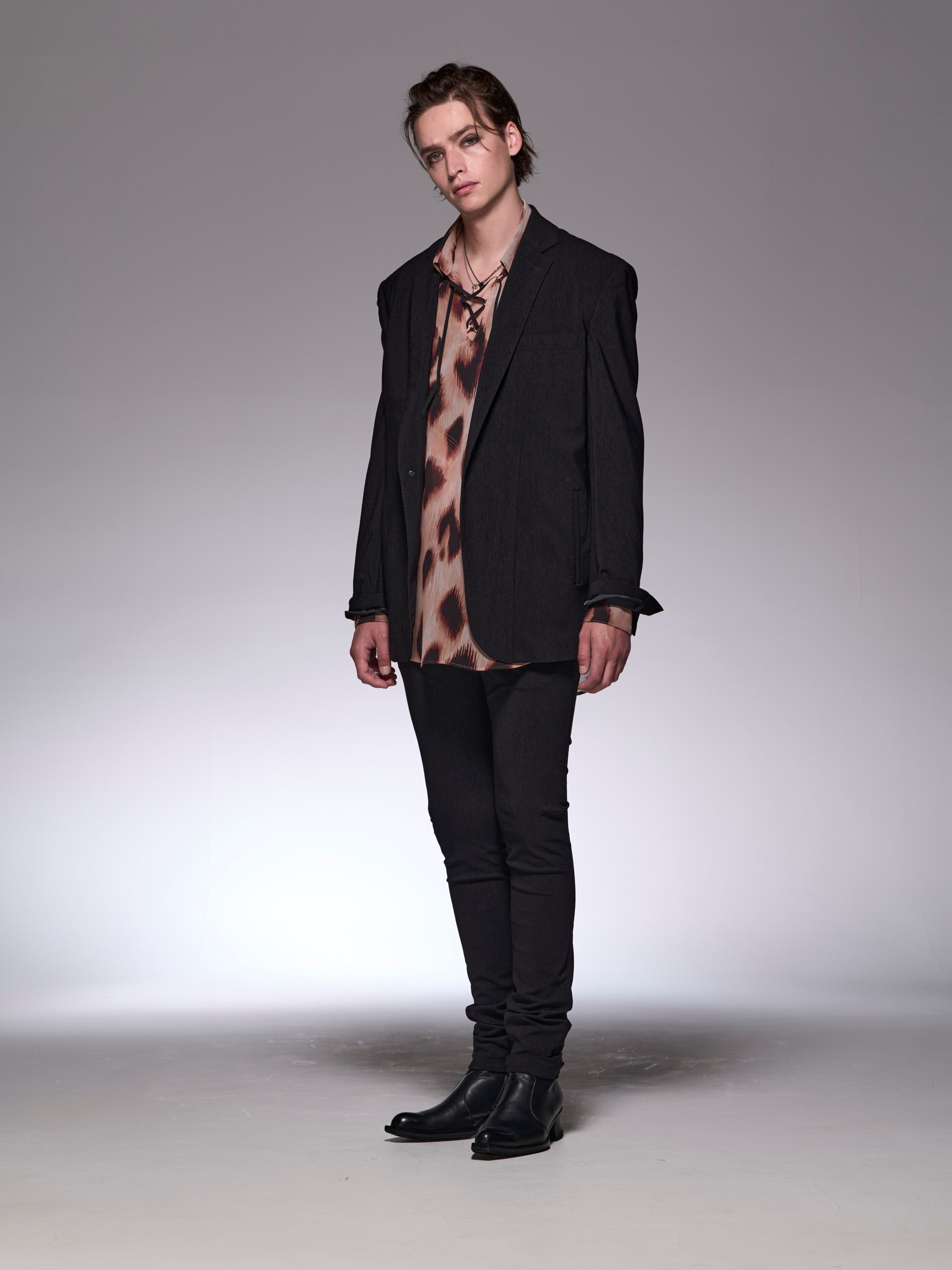 ストレッチ性に富むジャージ生地。細身のスラックス