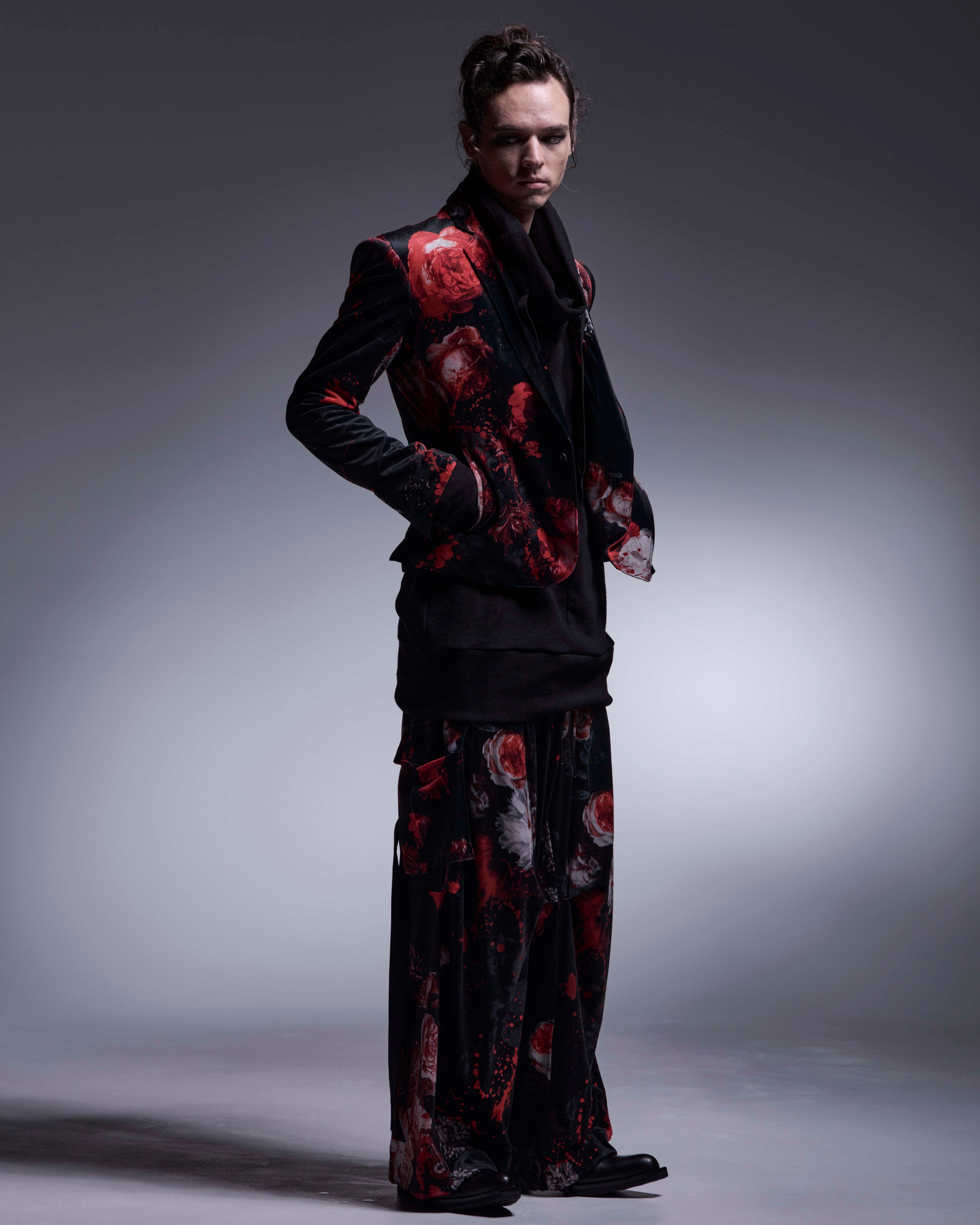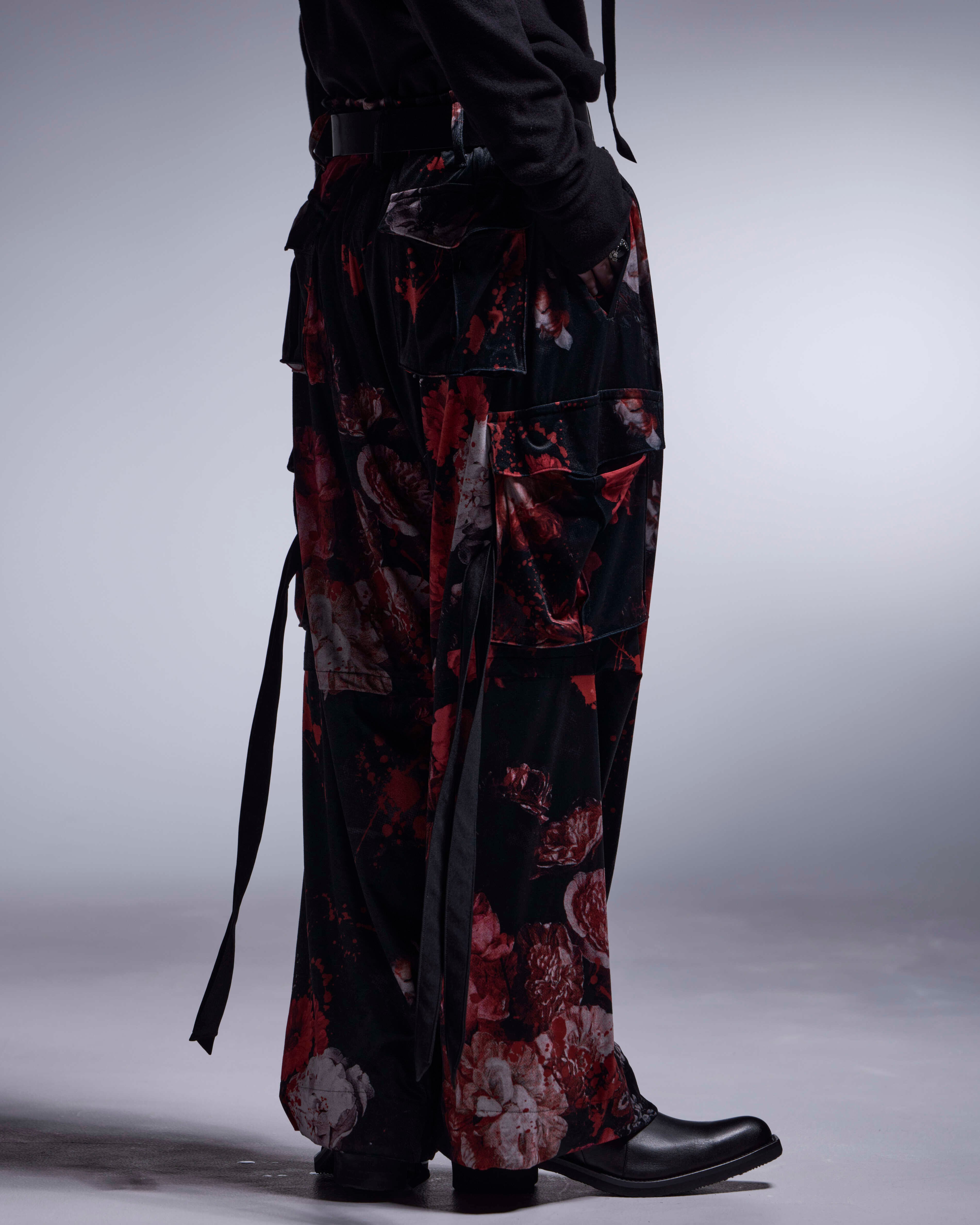 フローラ柄ベロア生地のワイドカーゴパンツ。