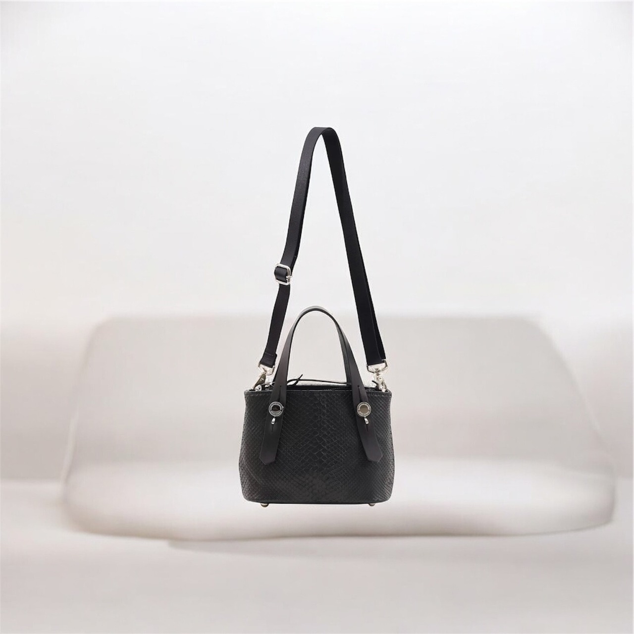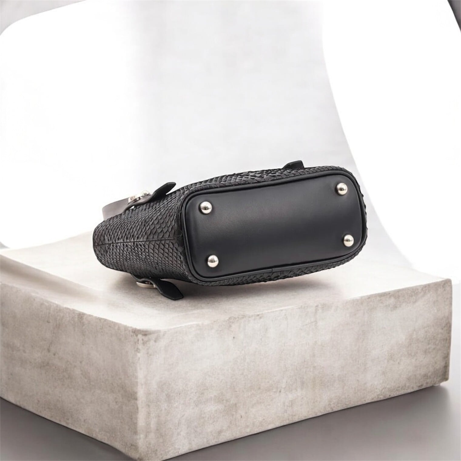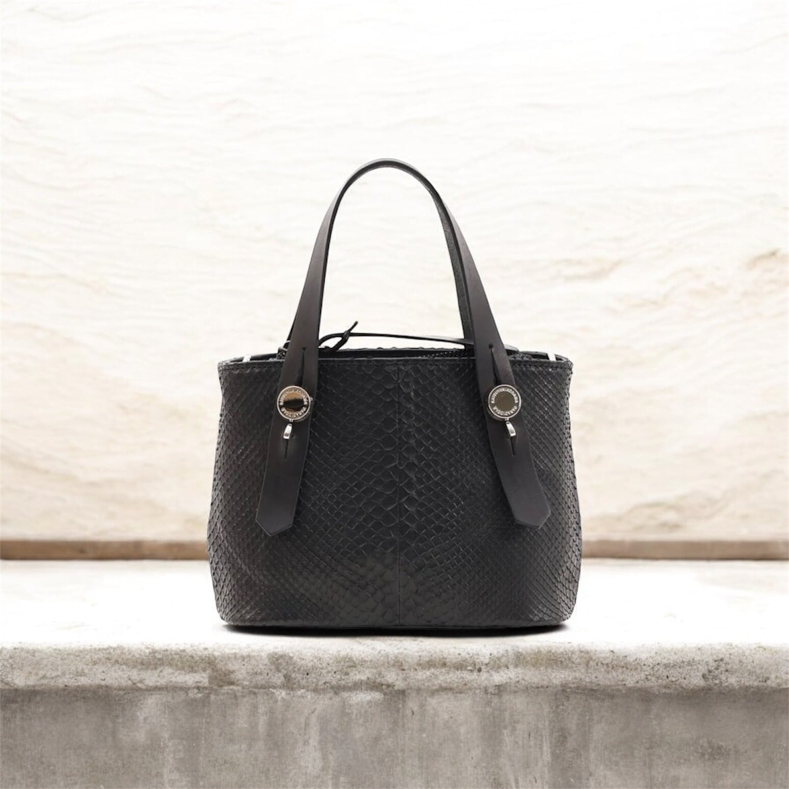 ハンドル部分の金具が特徴的なプチサイズのレザートートバッグ。ダイヤモンドパイソンを使用した高級モデルです