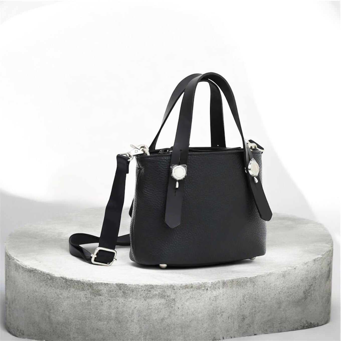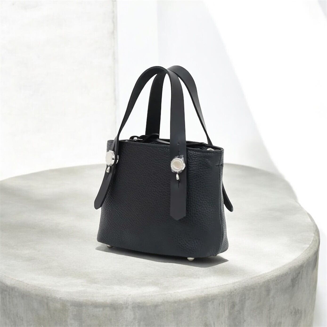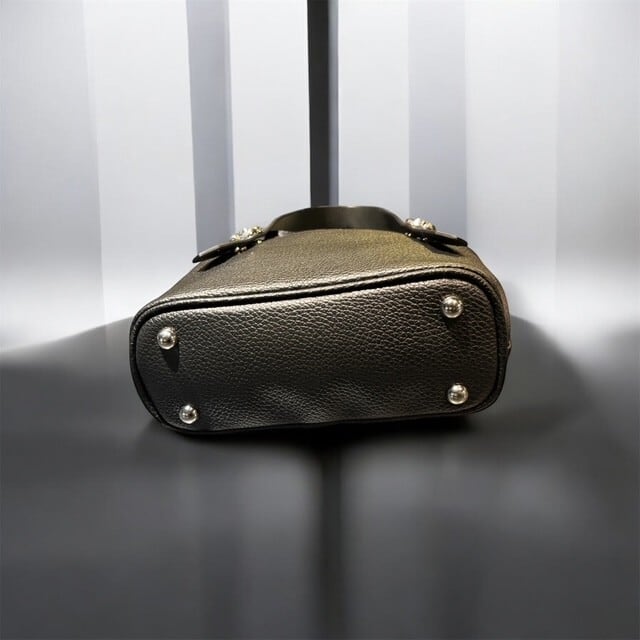 ハンドル部分の金具が特徴的なプチサイズのレザートートバッグです