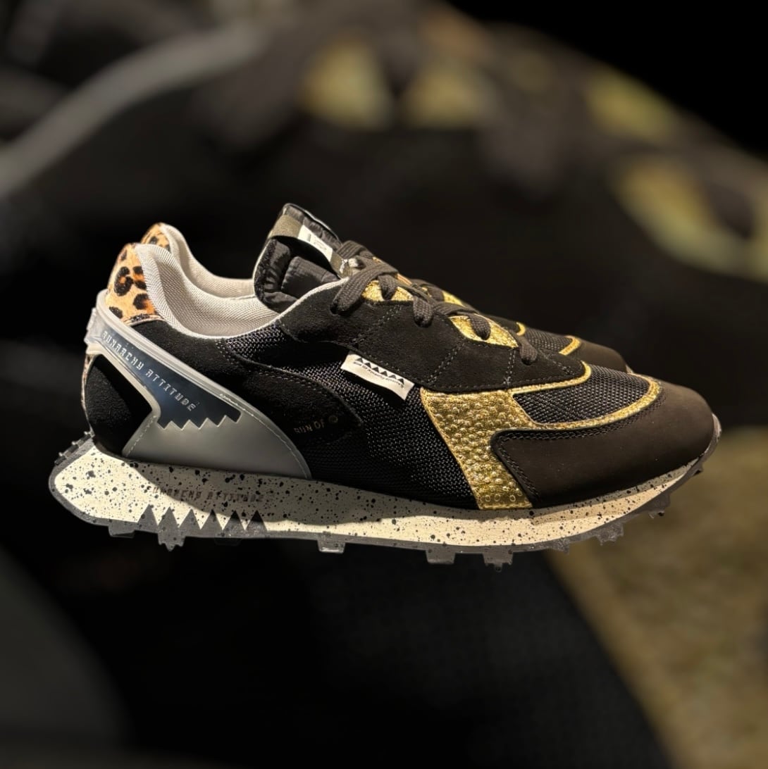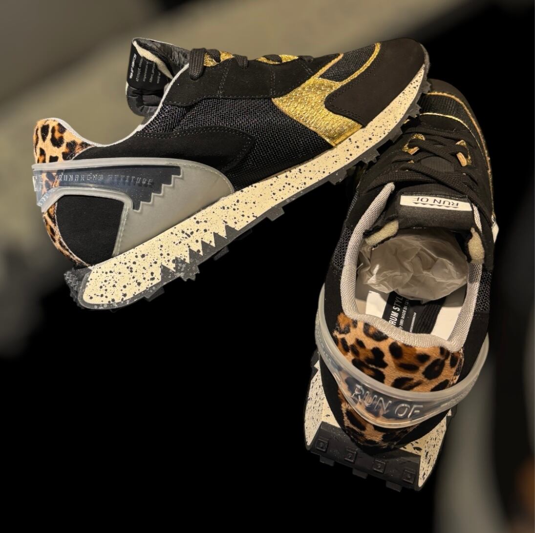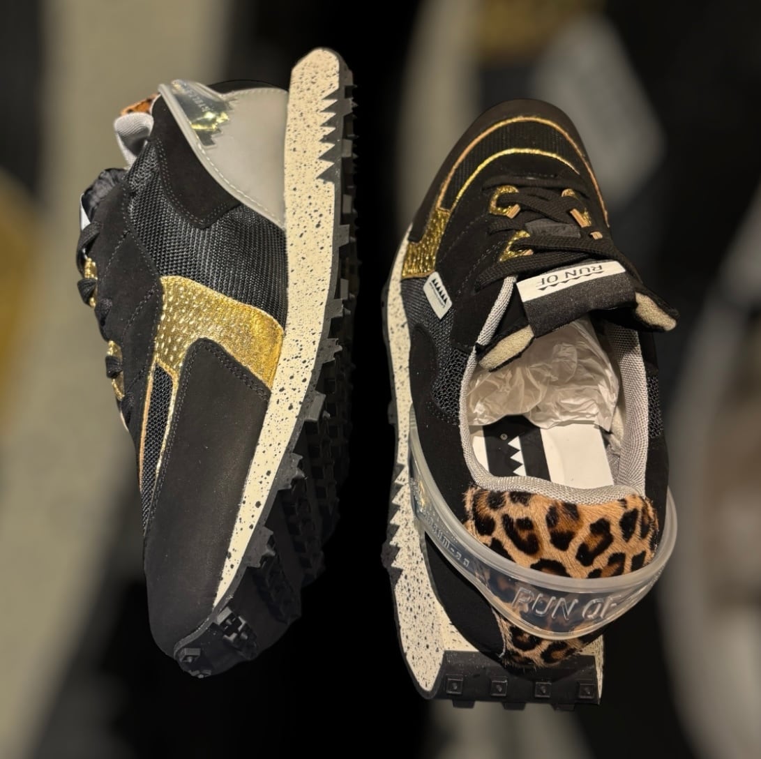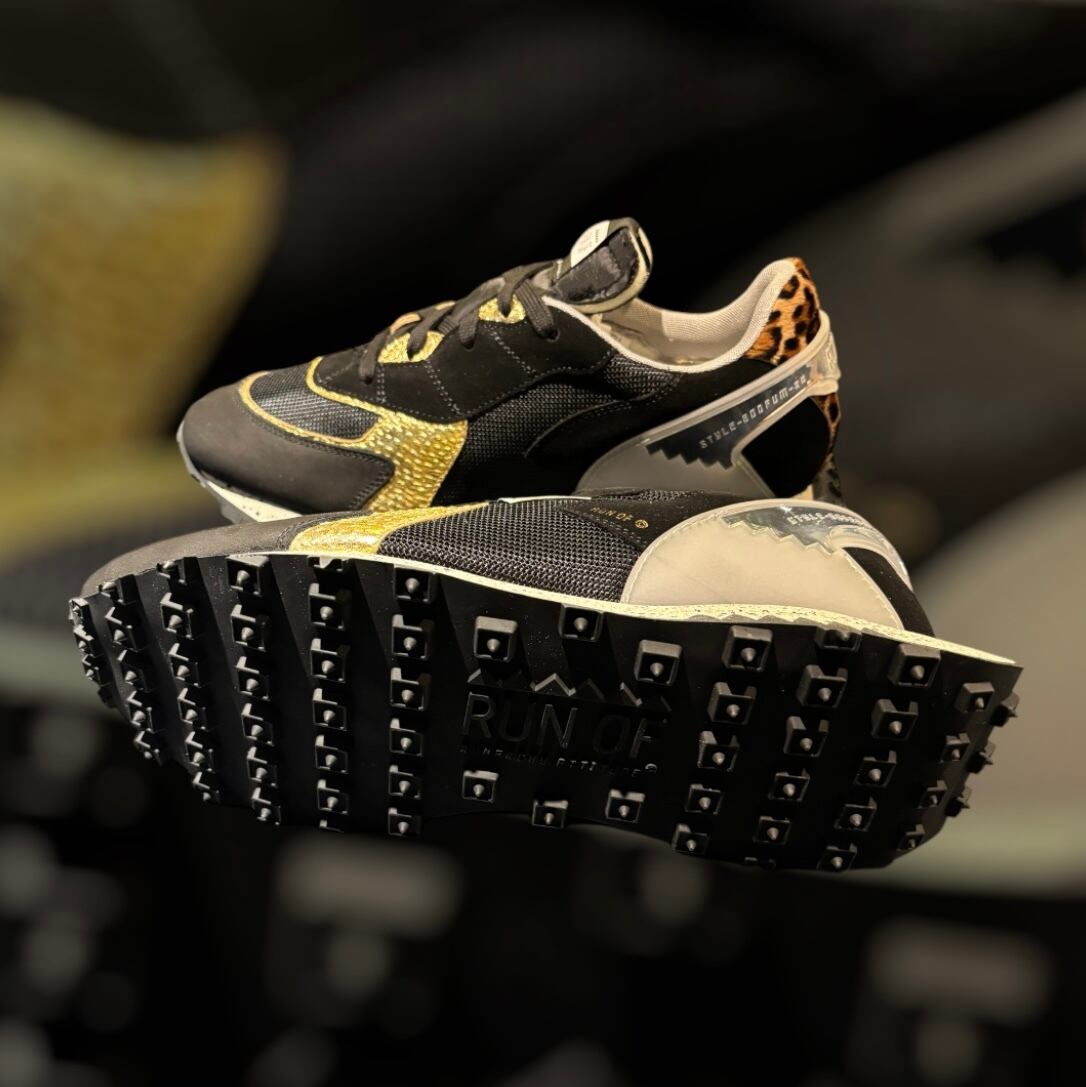 イタリア発のラグジュアリースニーカー「RUN OF」から、別注モデルが初登場。ブラックのアッパーにゴールドの型押しクロコ、かかとにレオパード柄をあしらった、実に艶っぽい一足が完成しました。
