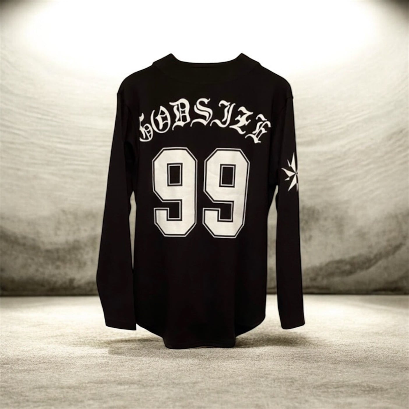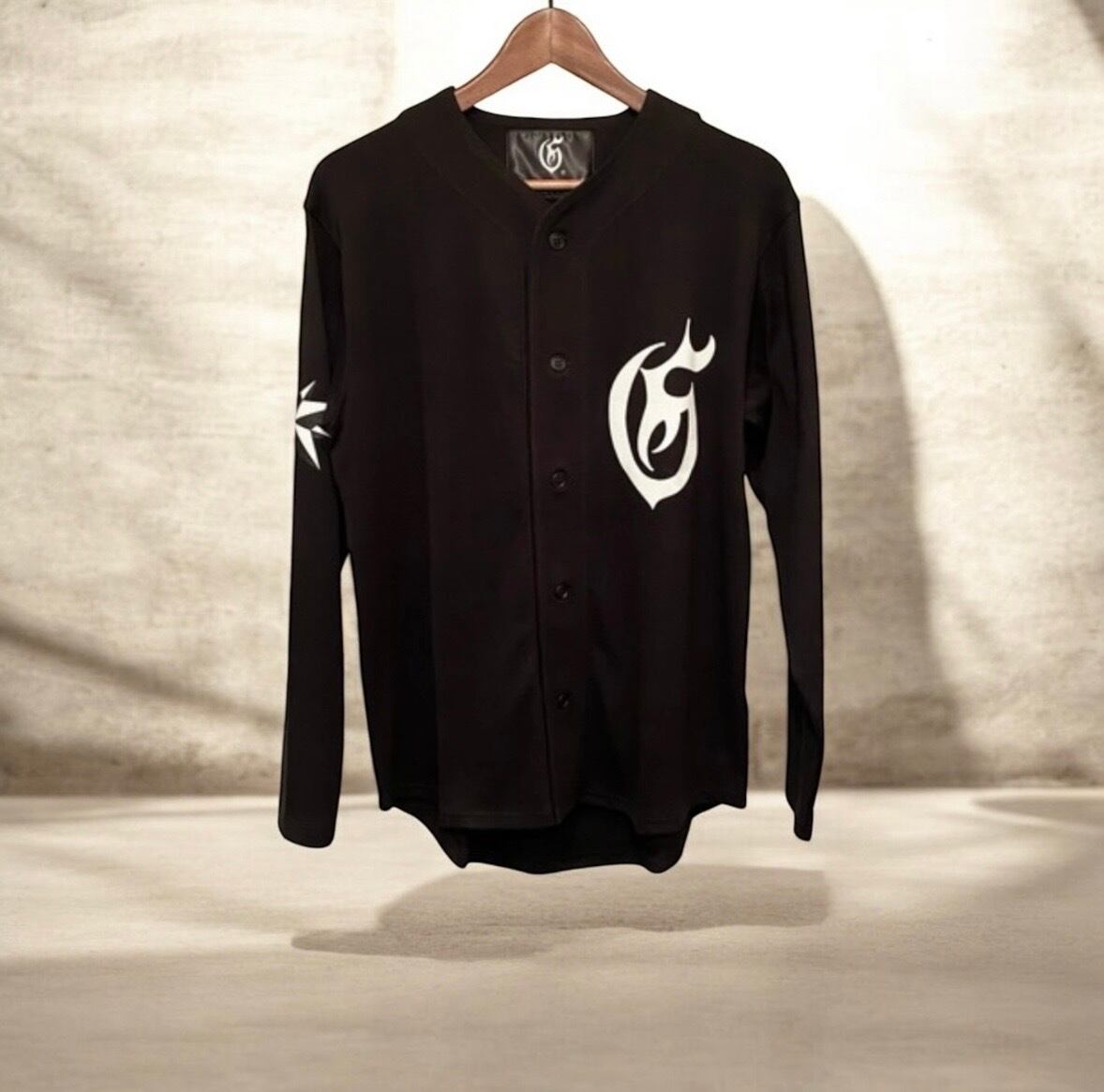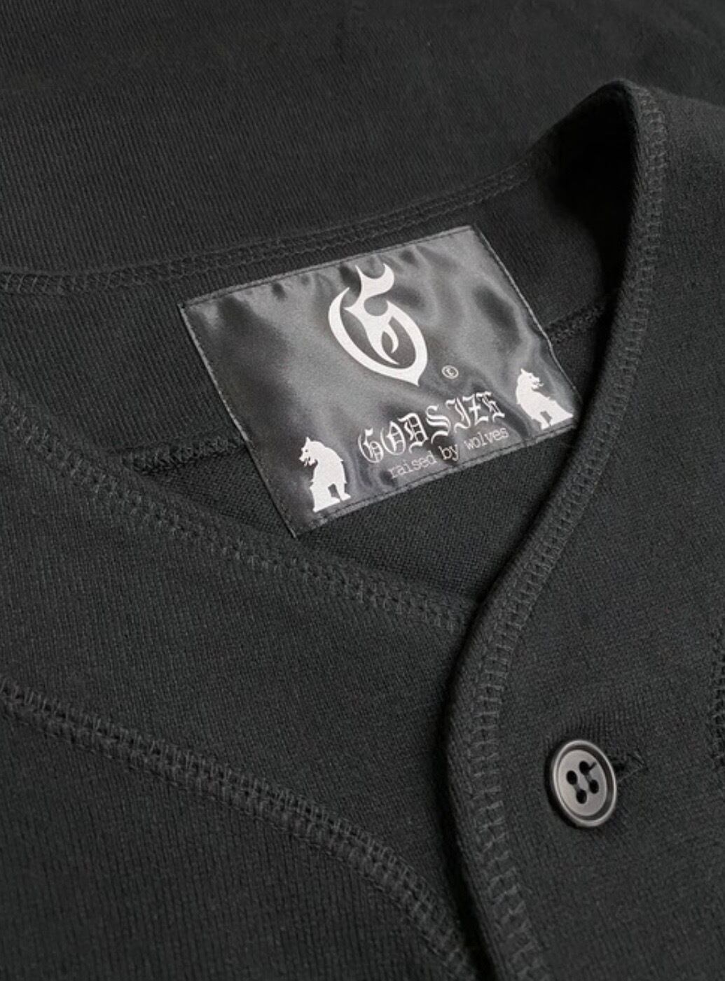 厚手のベースボールシャツに、GODSIZEのロゴマークを胸元にプリント。
