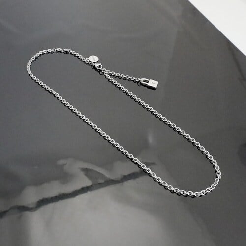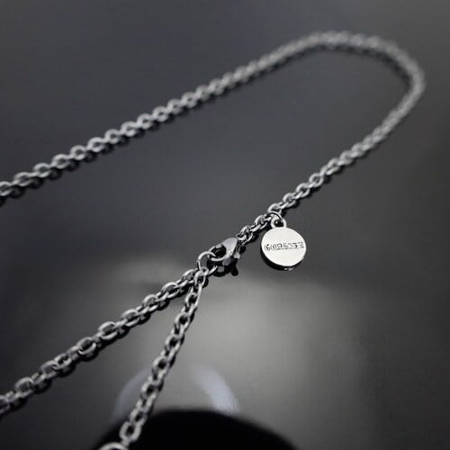 ネックレスチェーンには、医療用器具にも用いられる最高位の**サージカルステンレス(SUS316L)**を採用。その名の通り「手術用」としての信頼性を持ち、極めて高い低刺激性と耐食性を誇ります。変色や錆びを寄せ付けにくく、日常のあらゆるシーンにおいて、その輝きは色褪せることがありません。