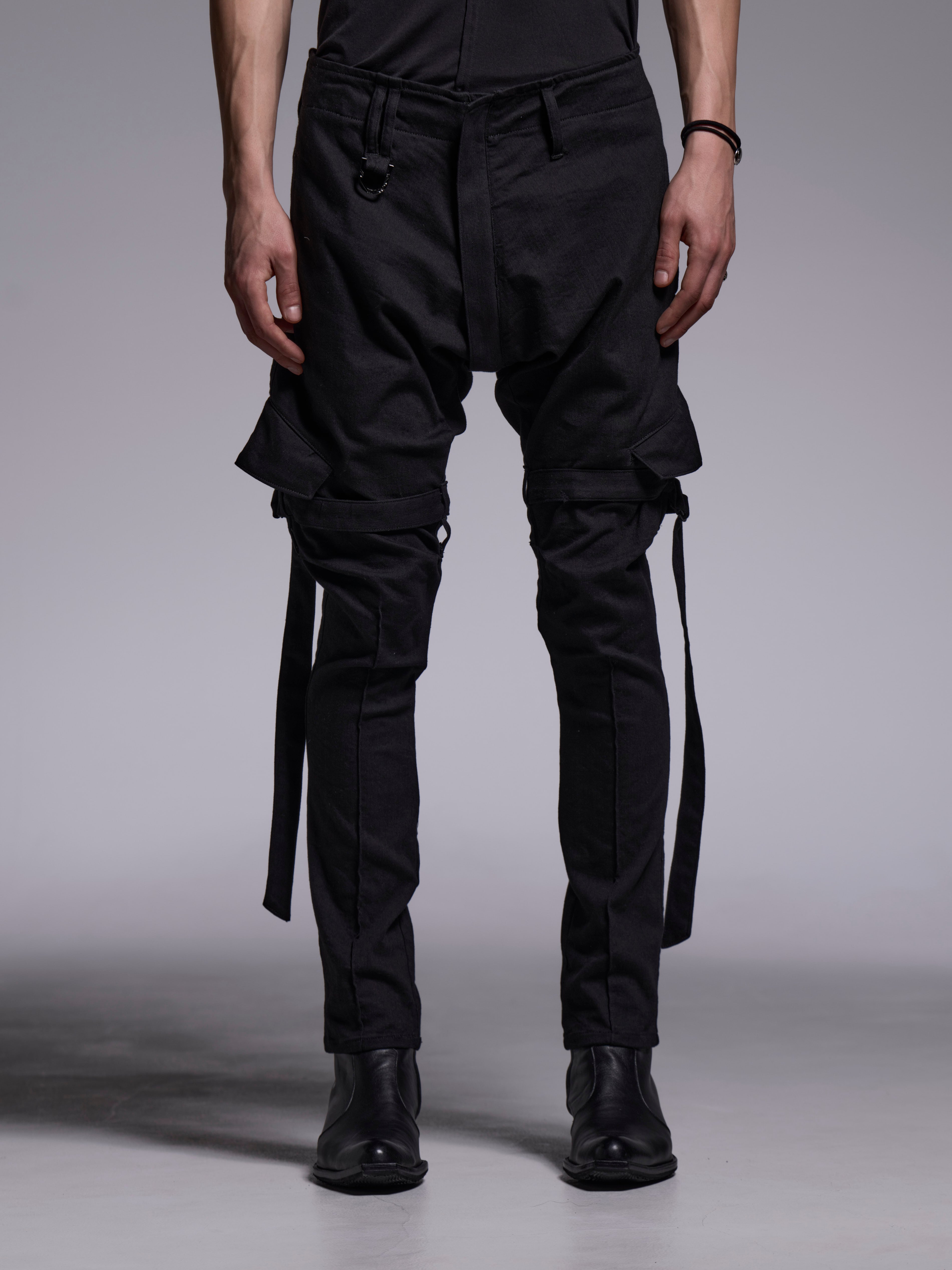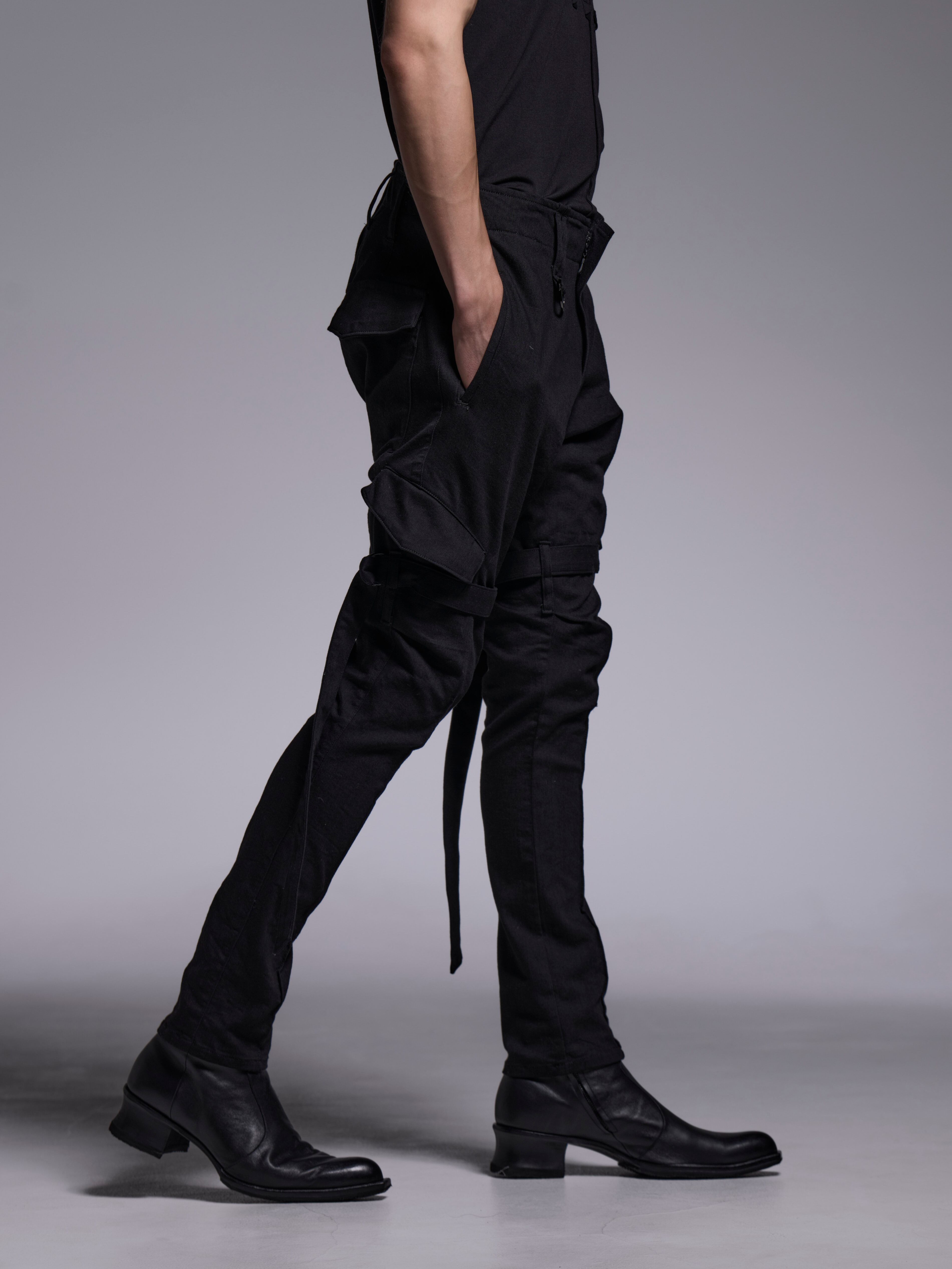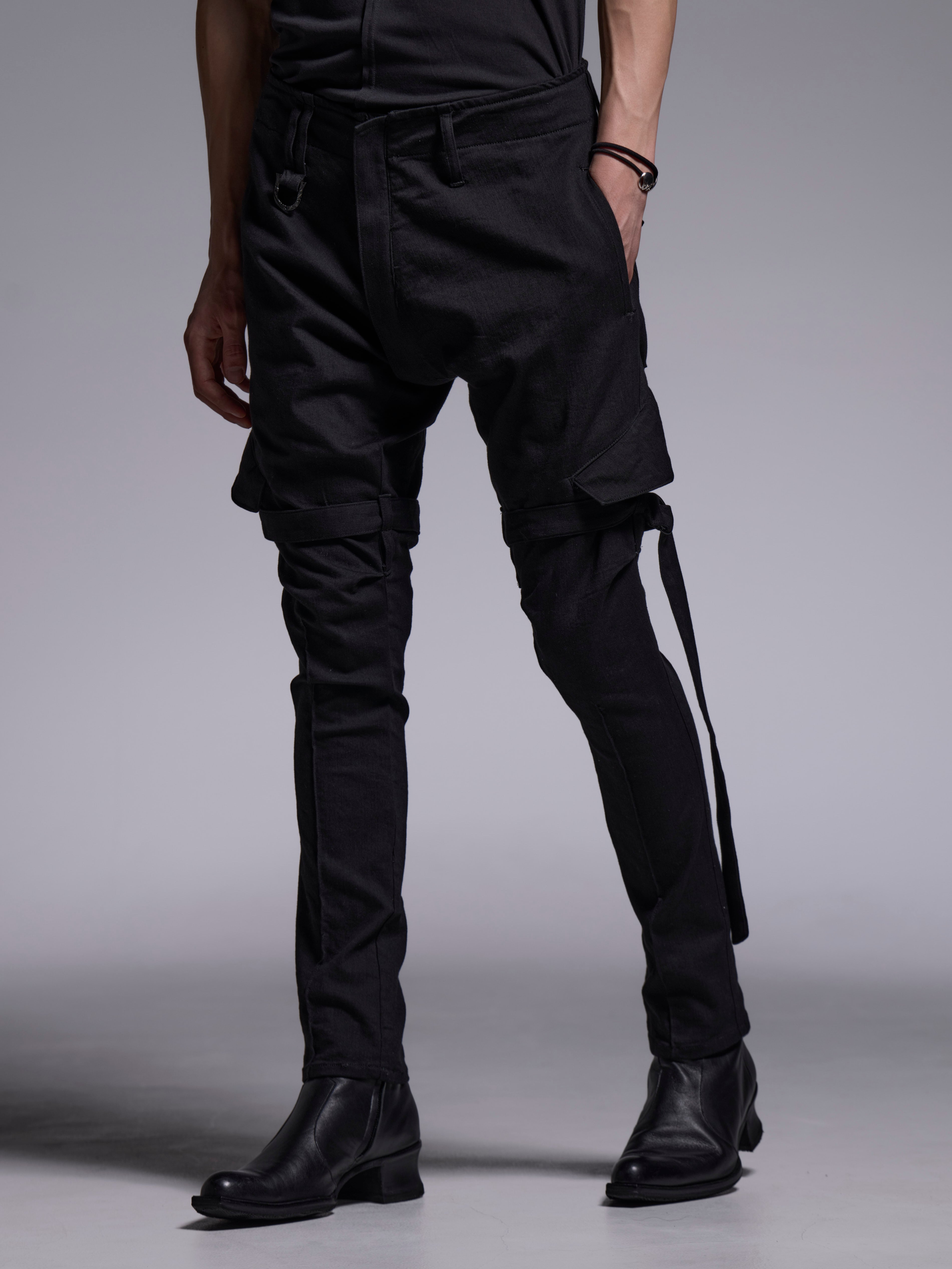 ストレッチが効いてるデニム素材のサルエルボンデージカーゴパンツ。