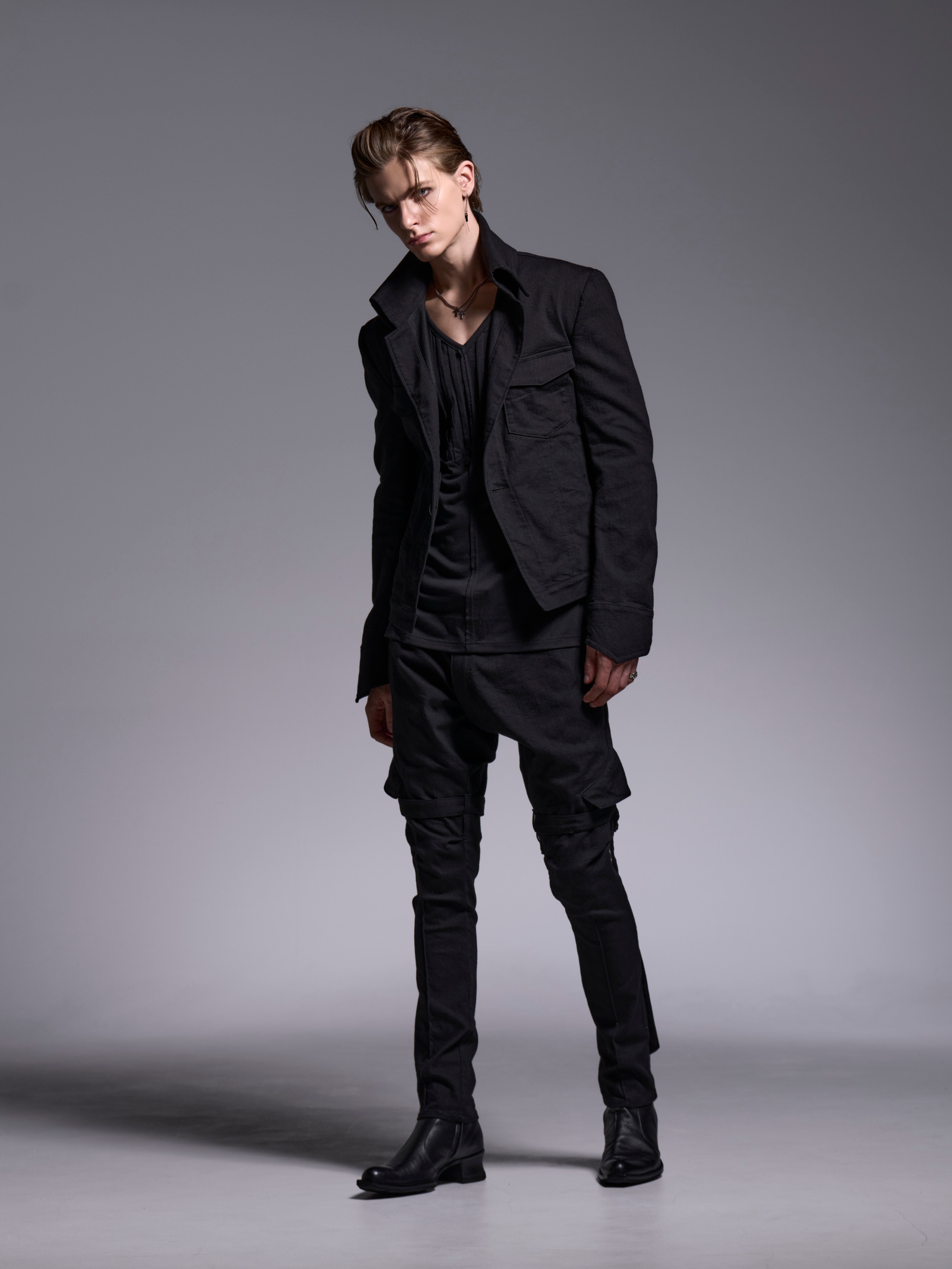 縦糸黒、横糸黒の6オンスの薄手のデニム素材。