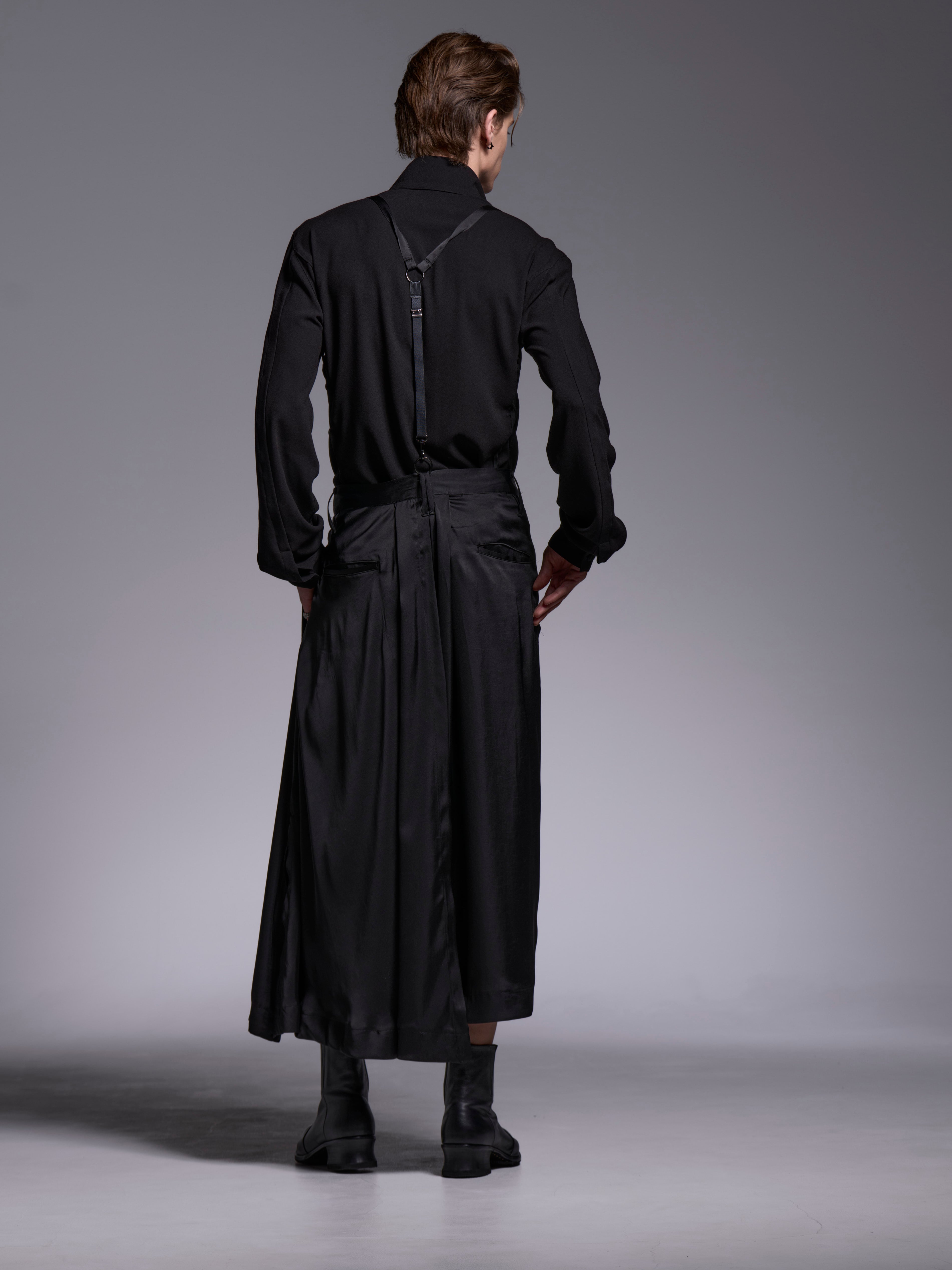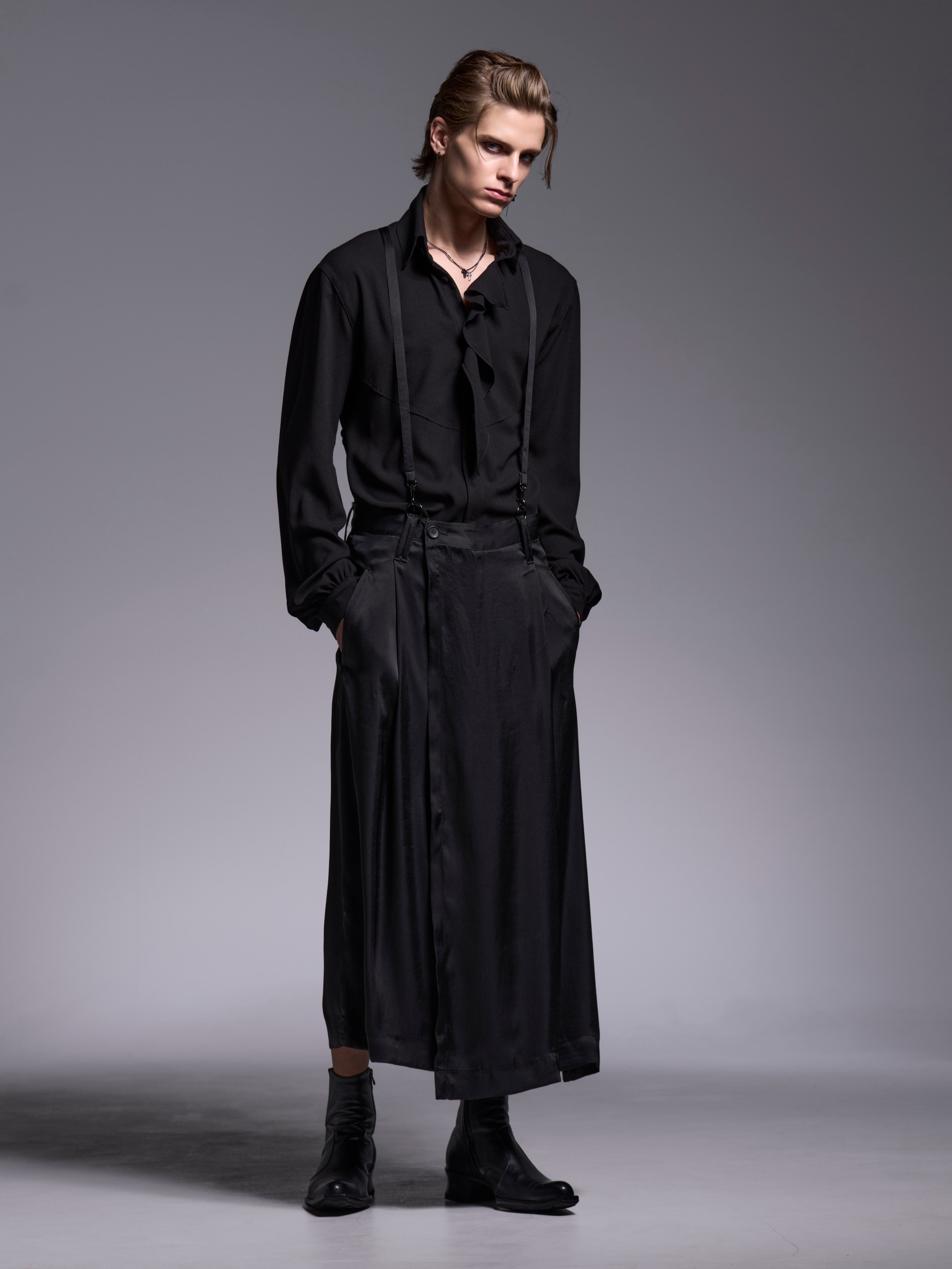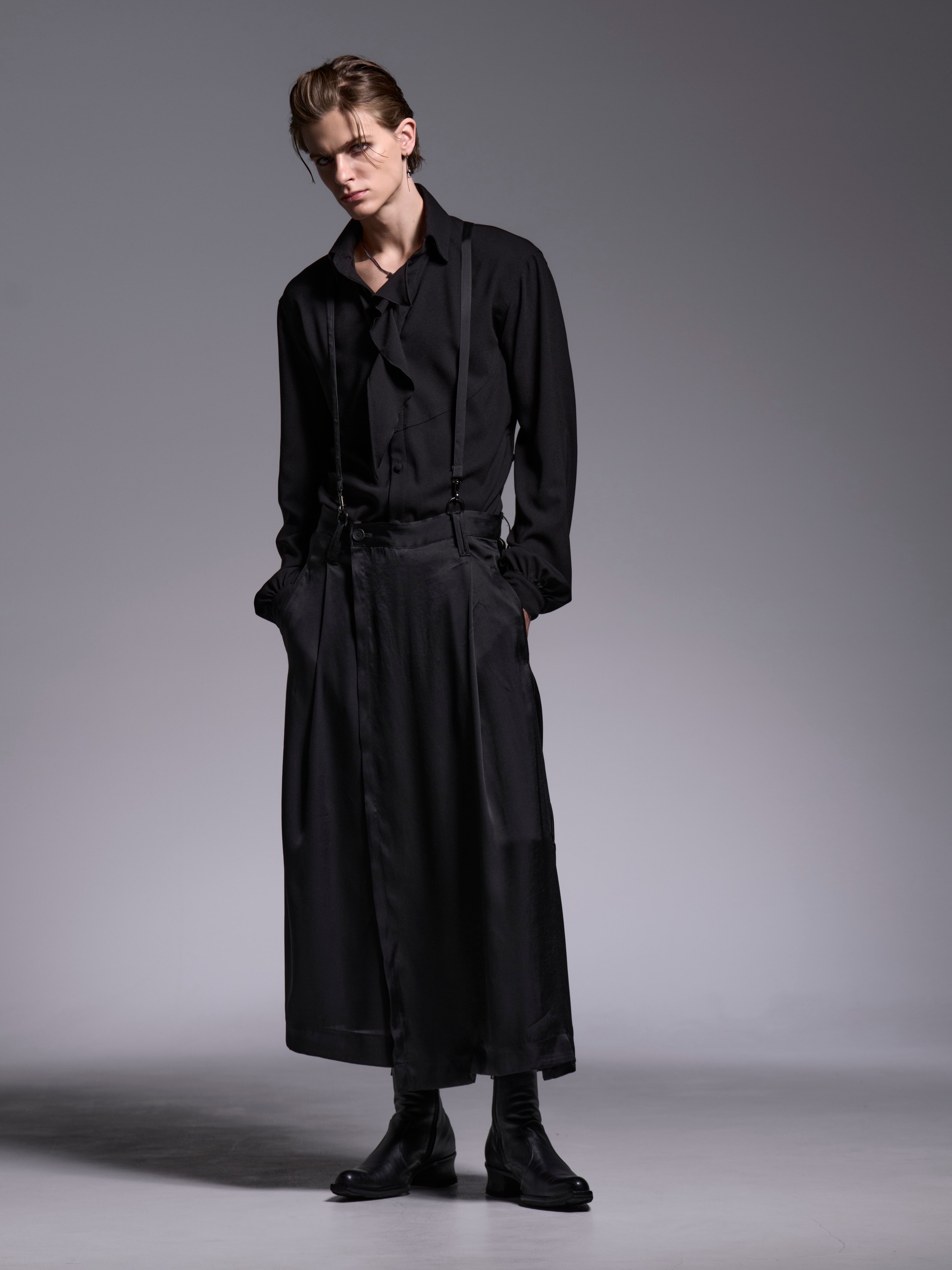 シャツ生地のスカート風腰当て付きワイドスラックス。