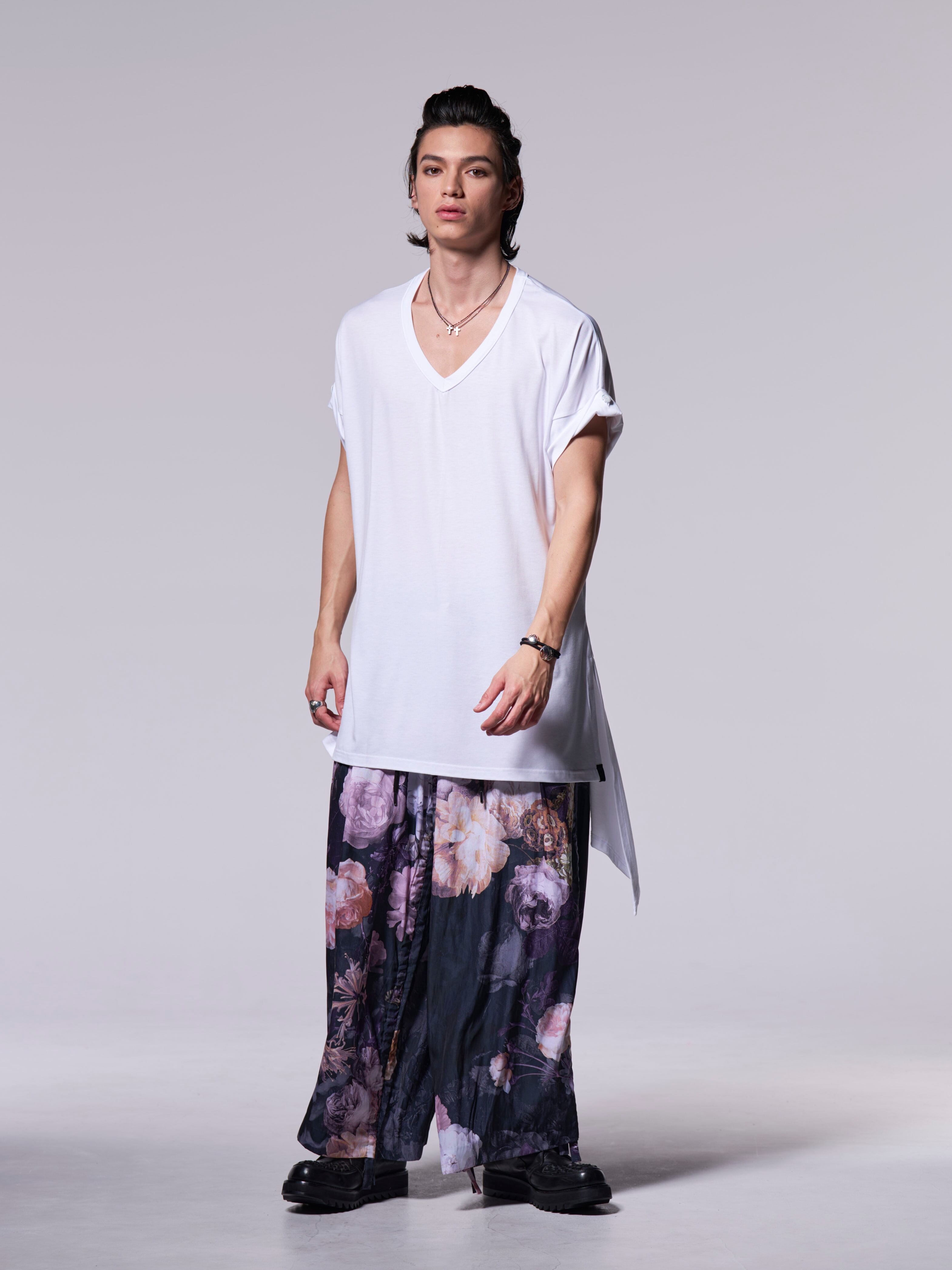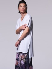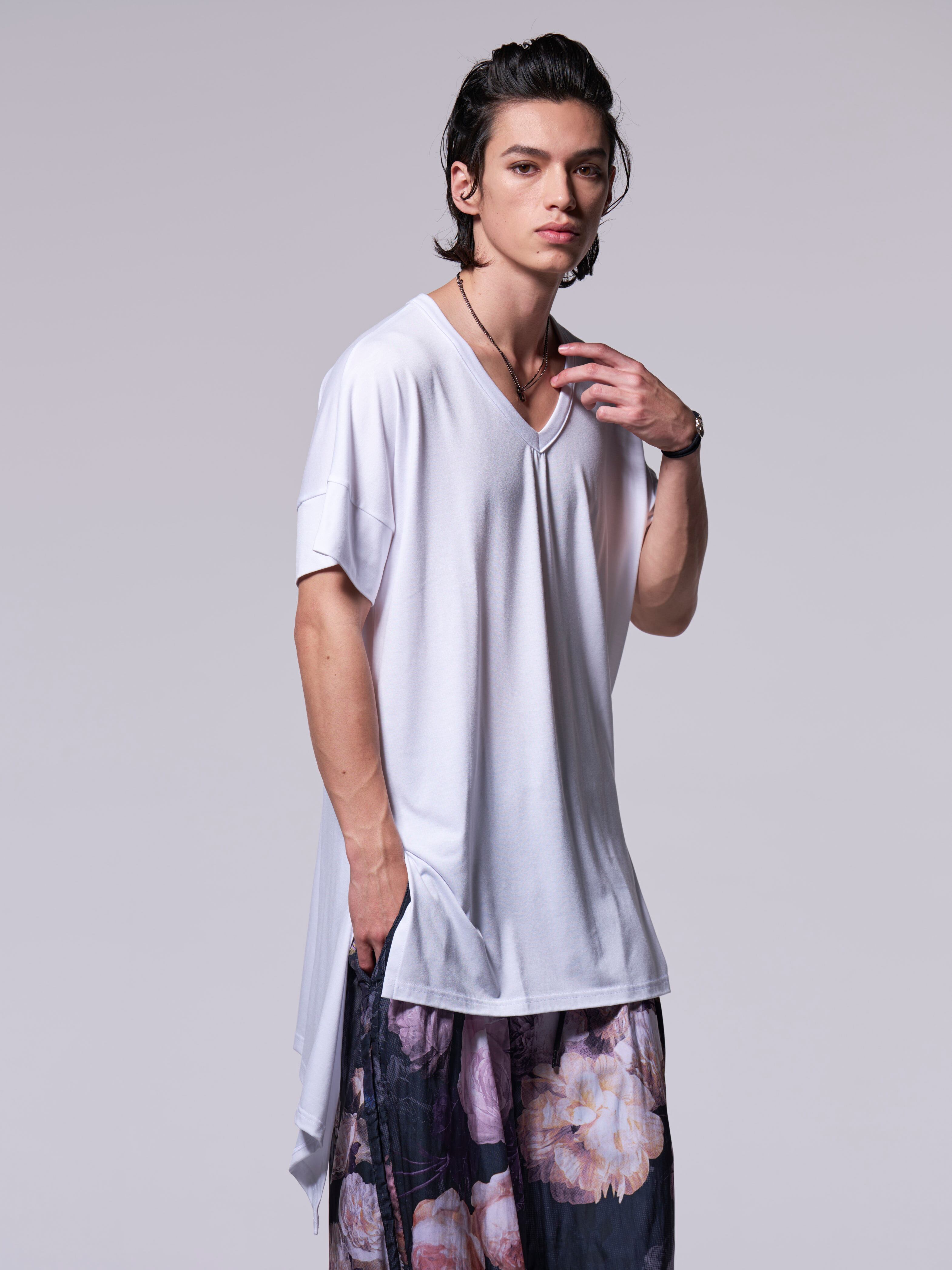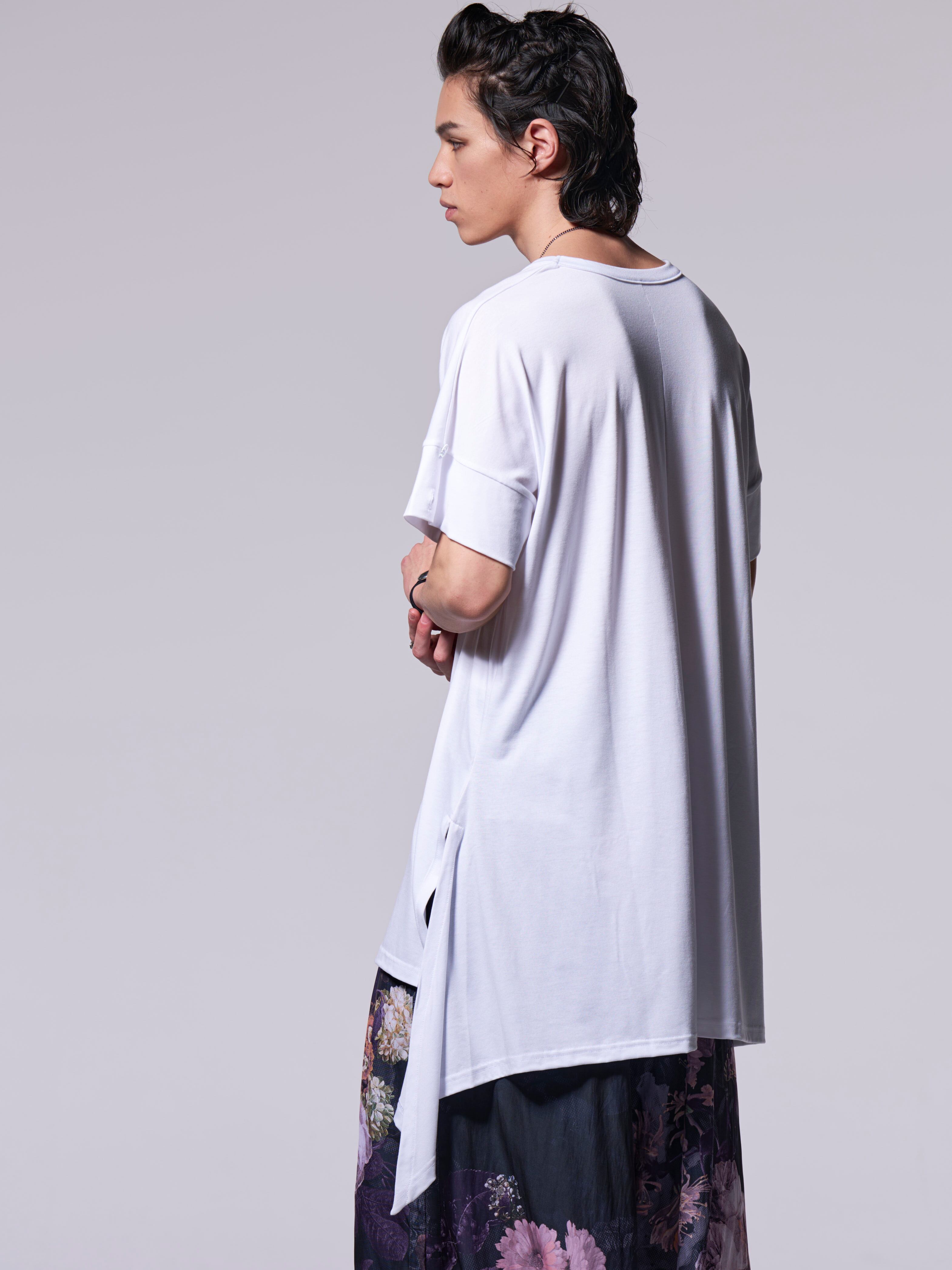 袖口の釦で雰囲気出し。ゆったり分量のフレアスリットTシャツ。