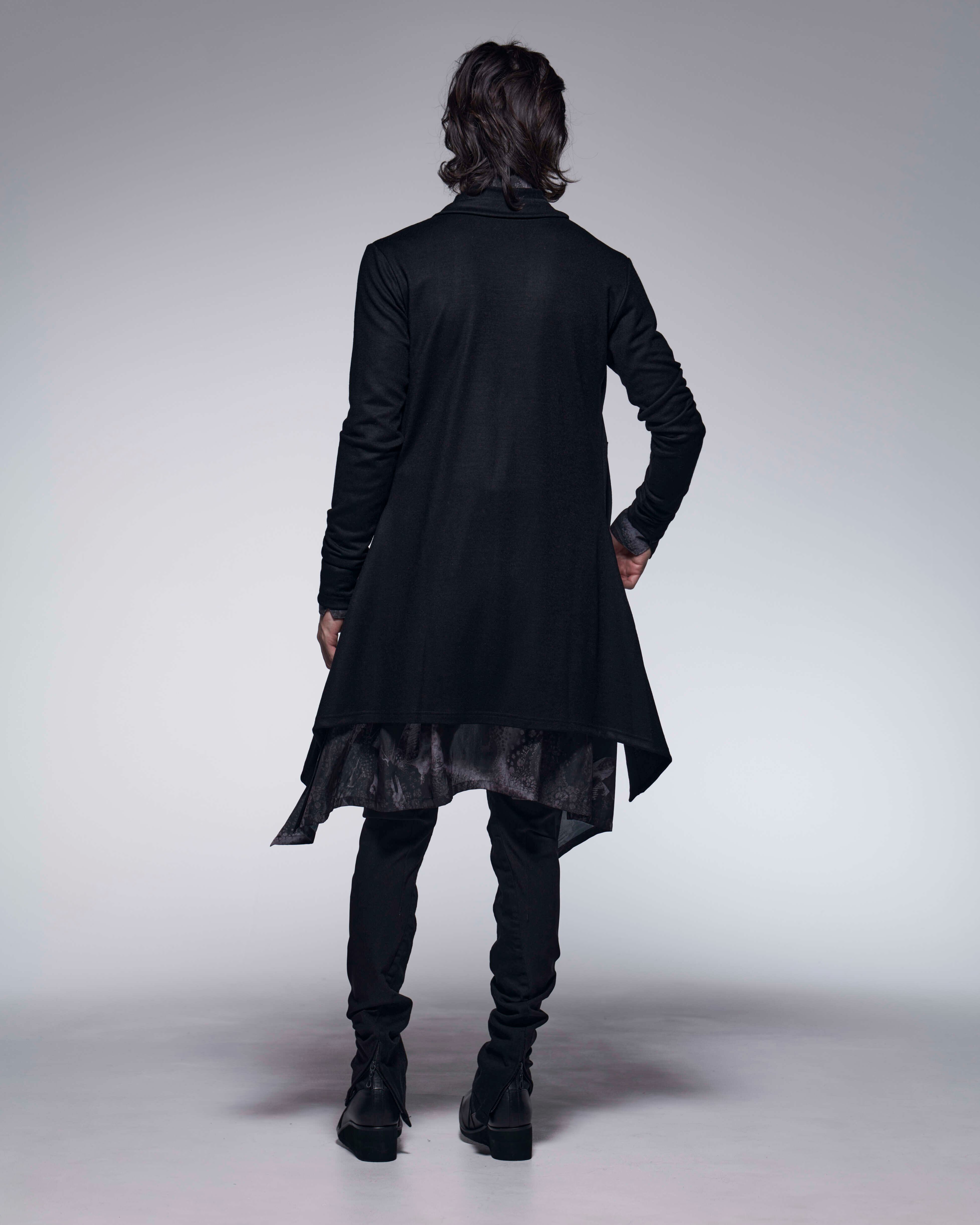 左右後脇にドレープのあるフレアデザインのロングシャツ。