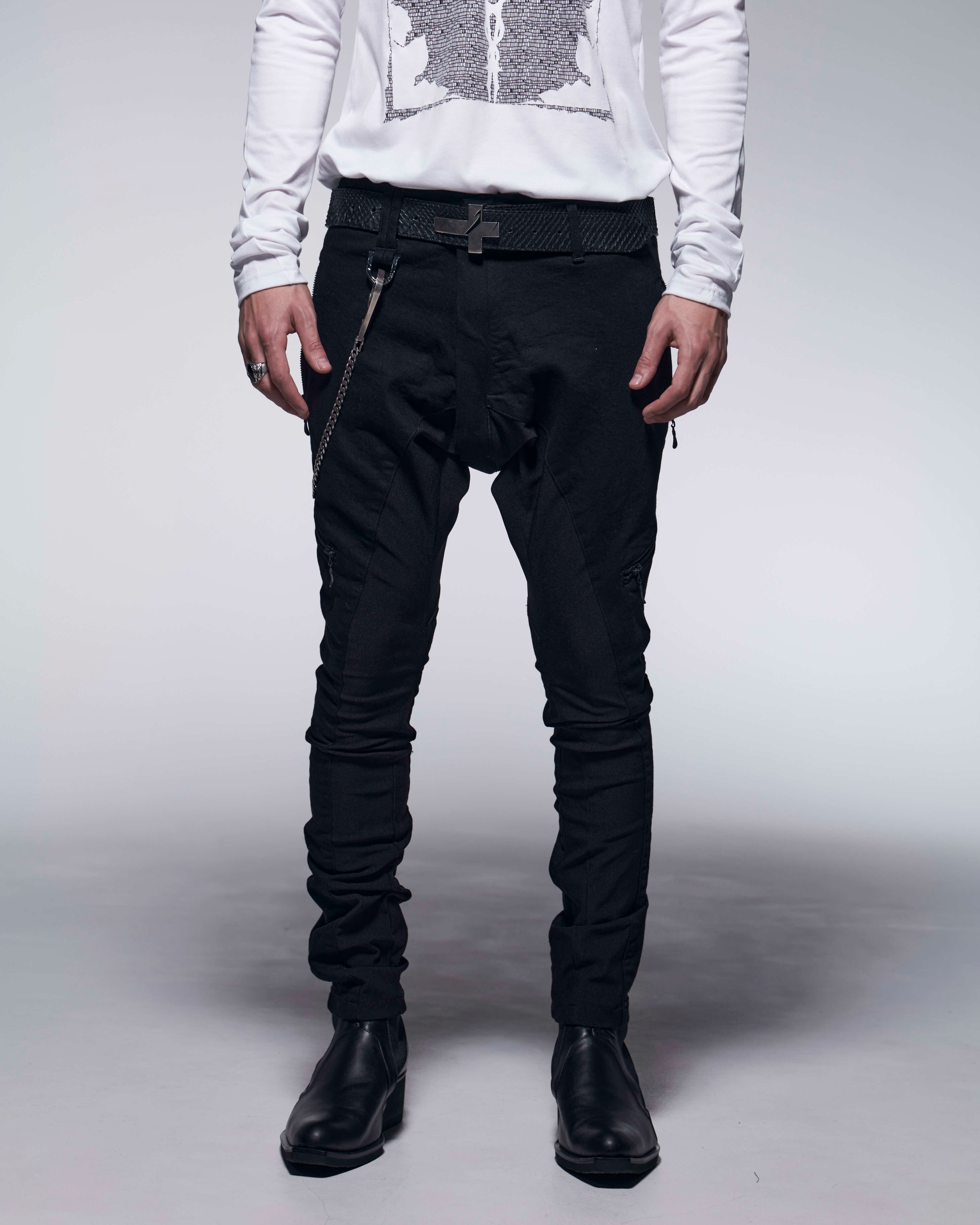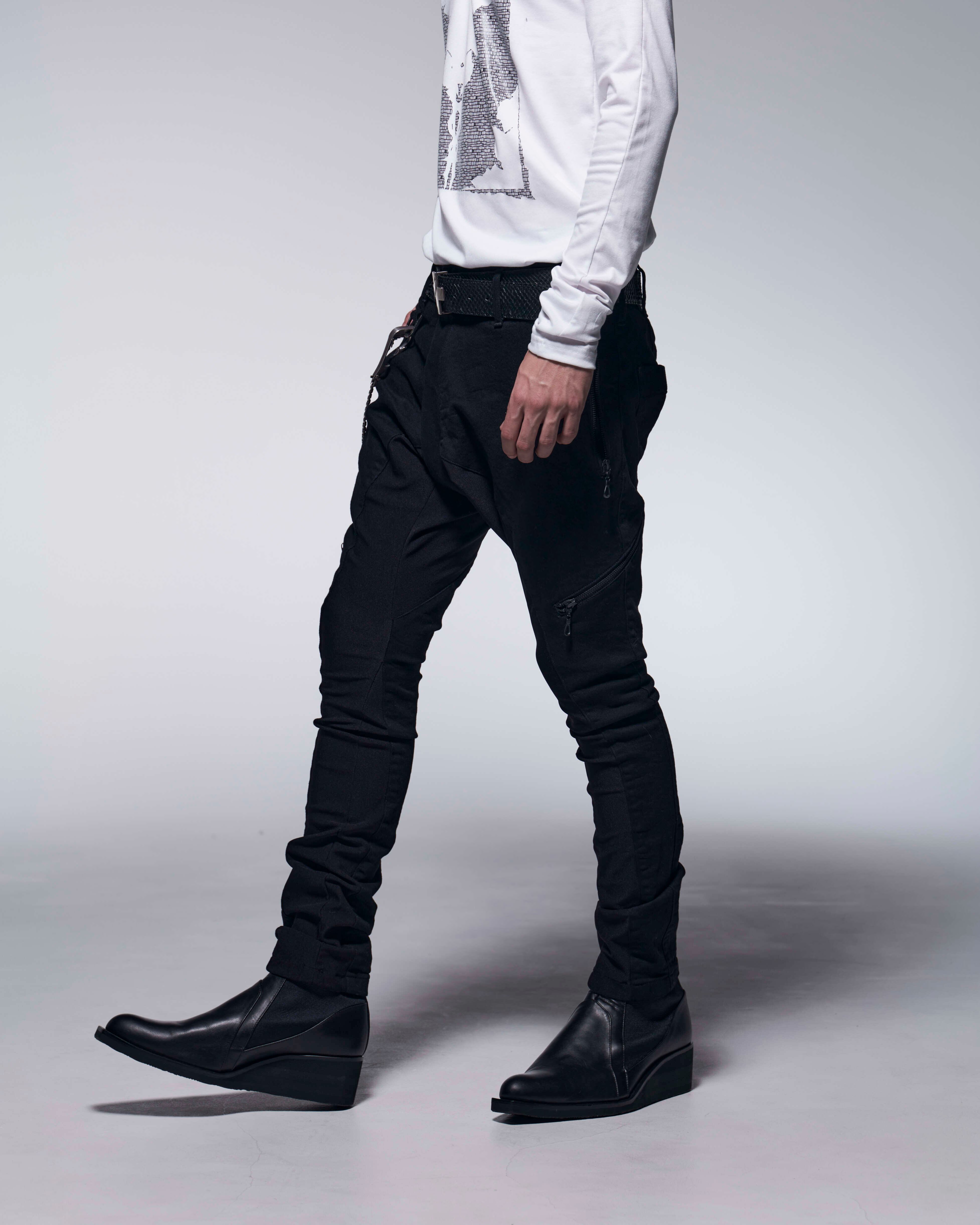 #黒ツイルジャージのコンビネーションサルエルパンツ。