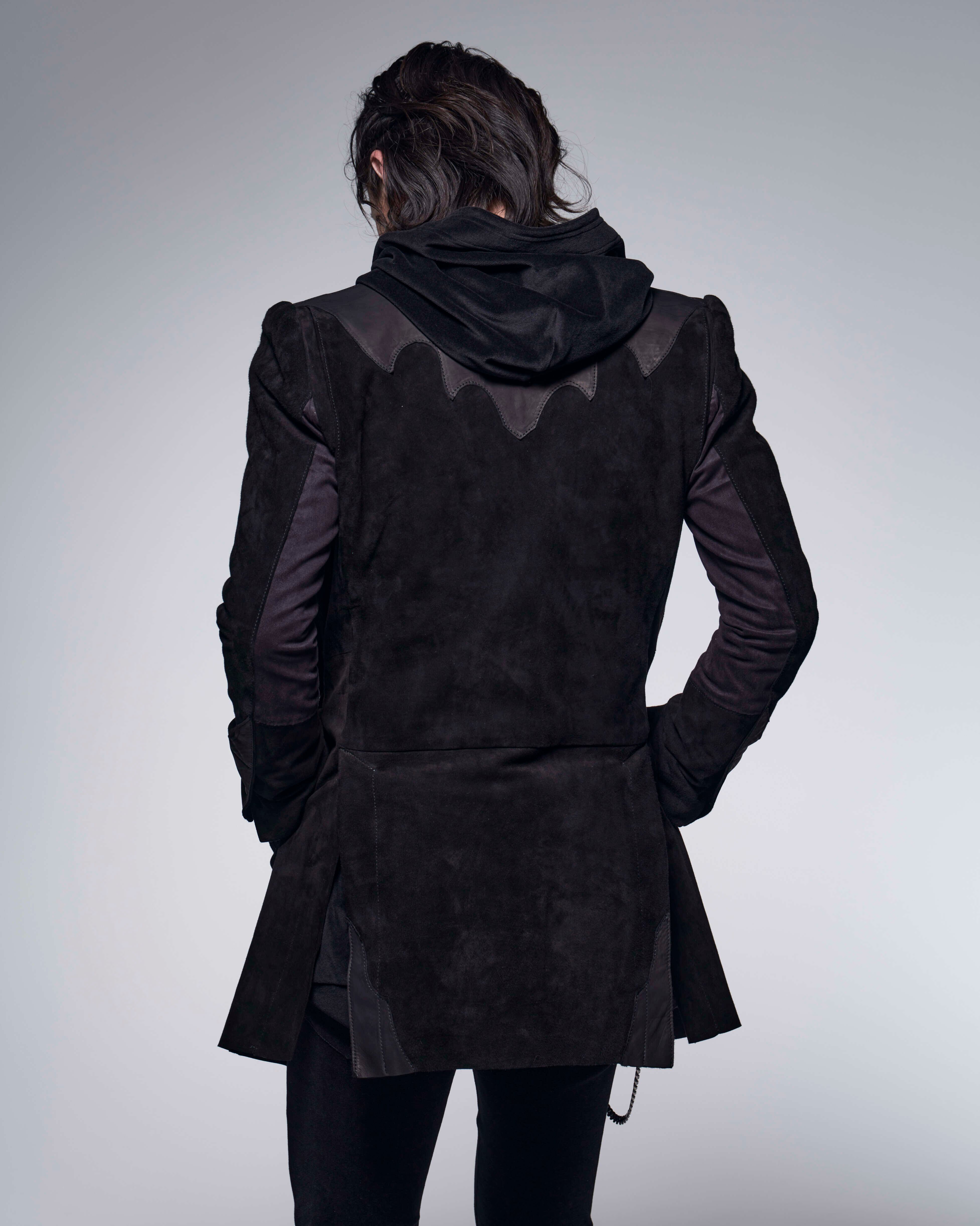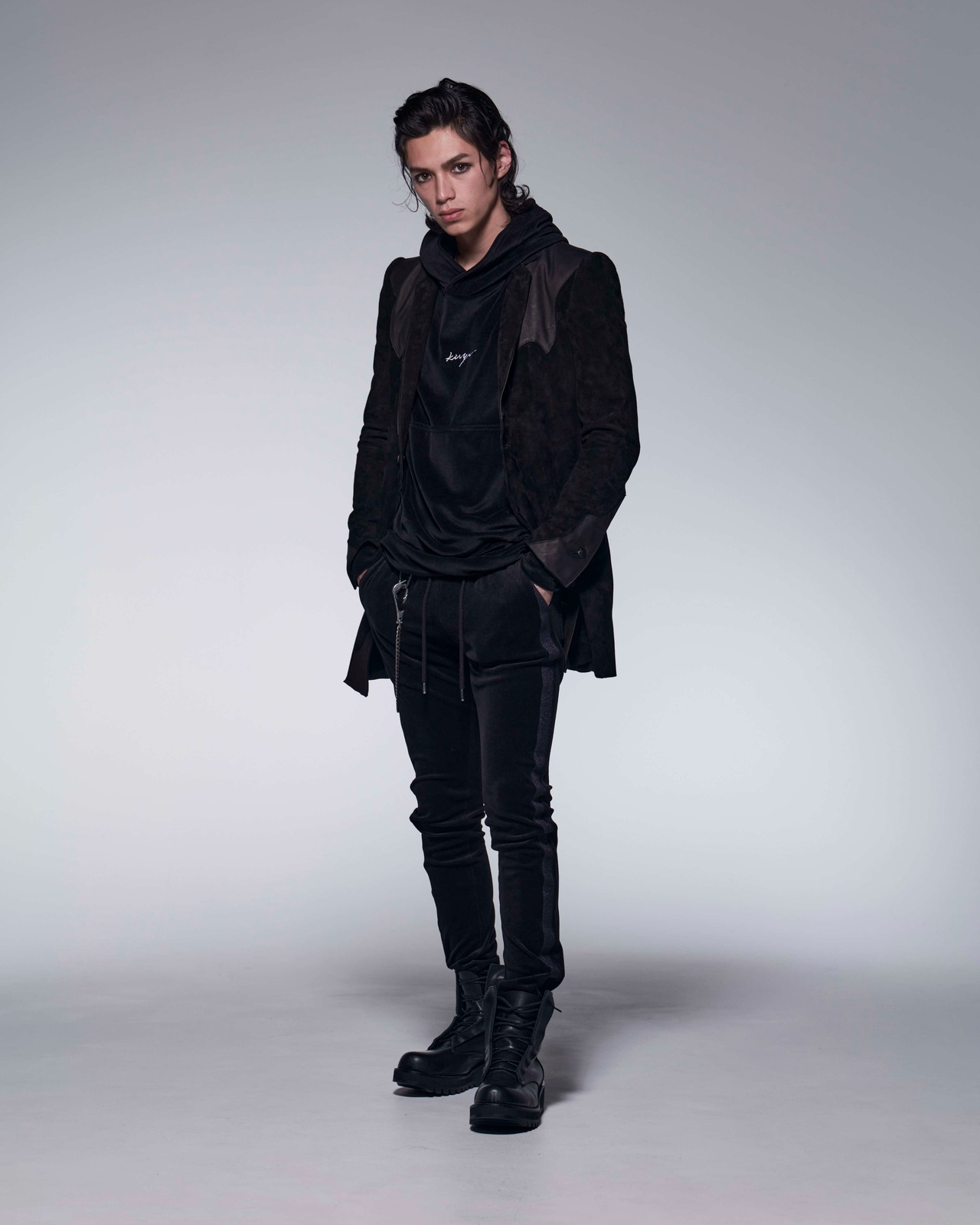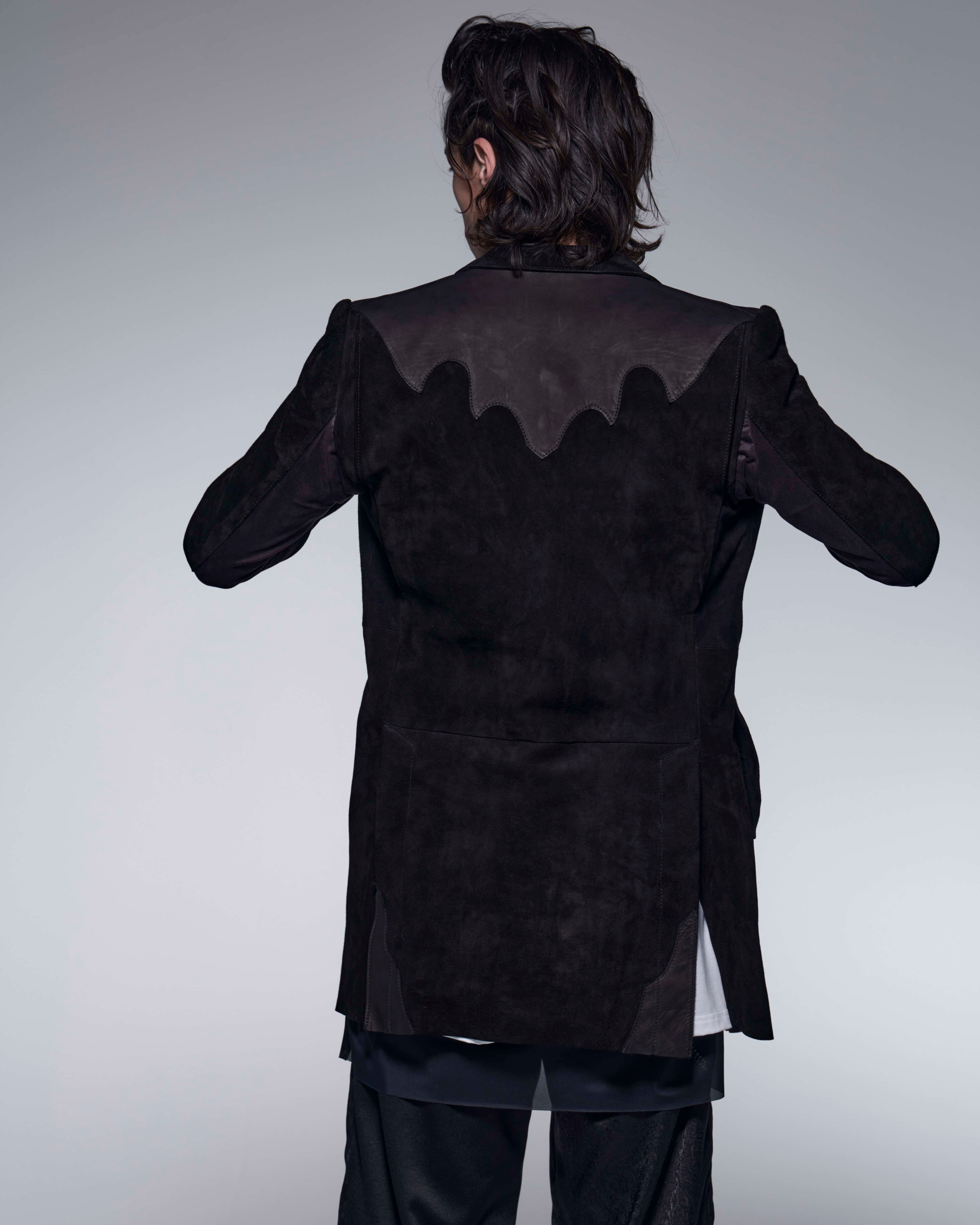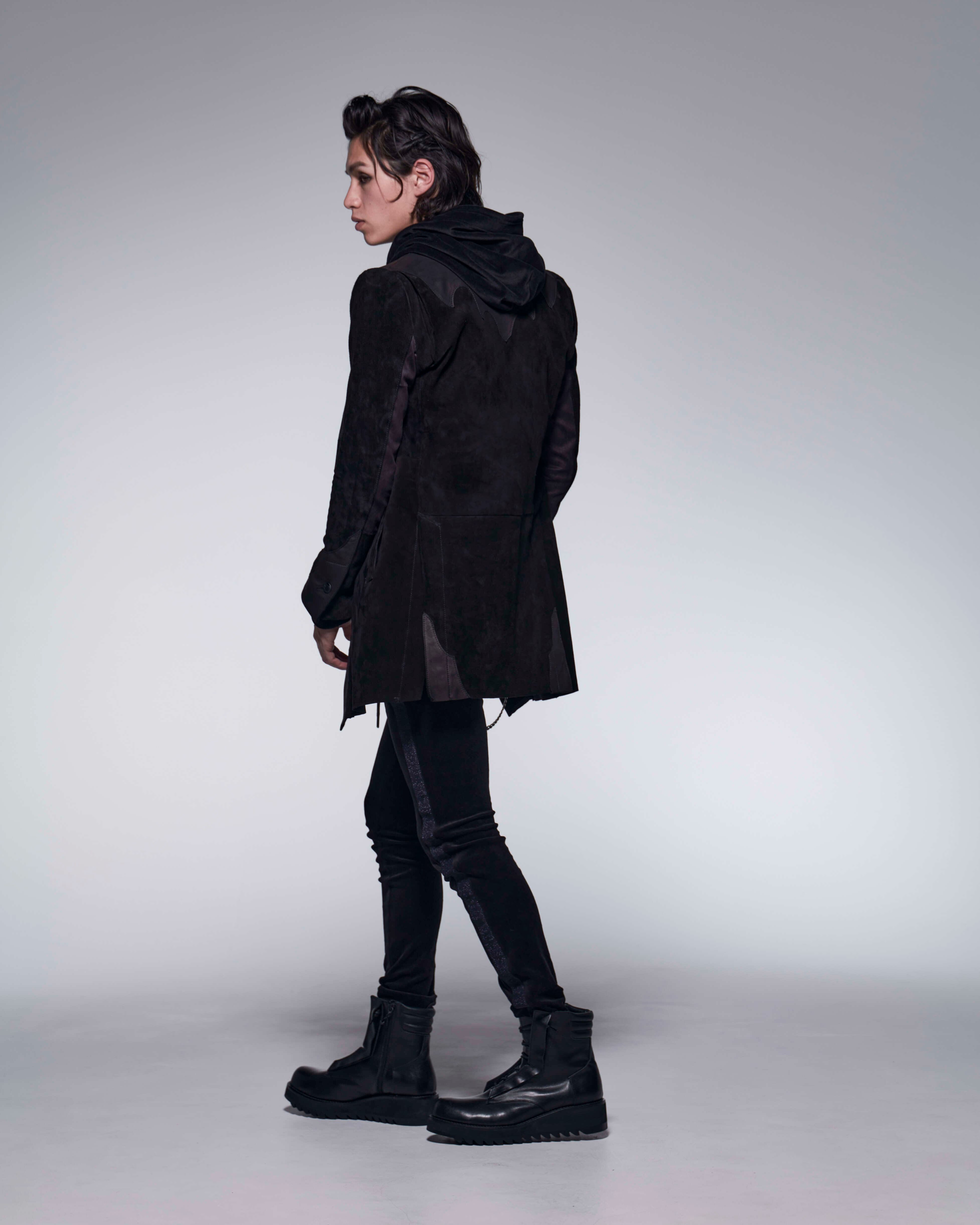 胸、後肩、裾、袖開部分のスムース部分のカット柄は、