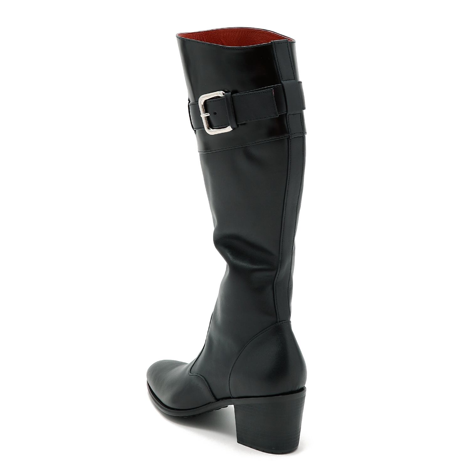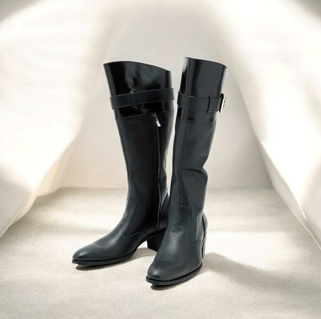 エレガントなベルデッドロングヒールブーツ。