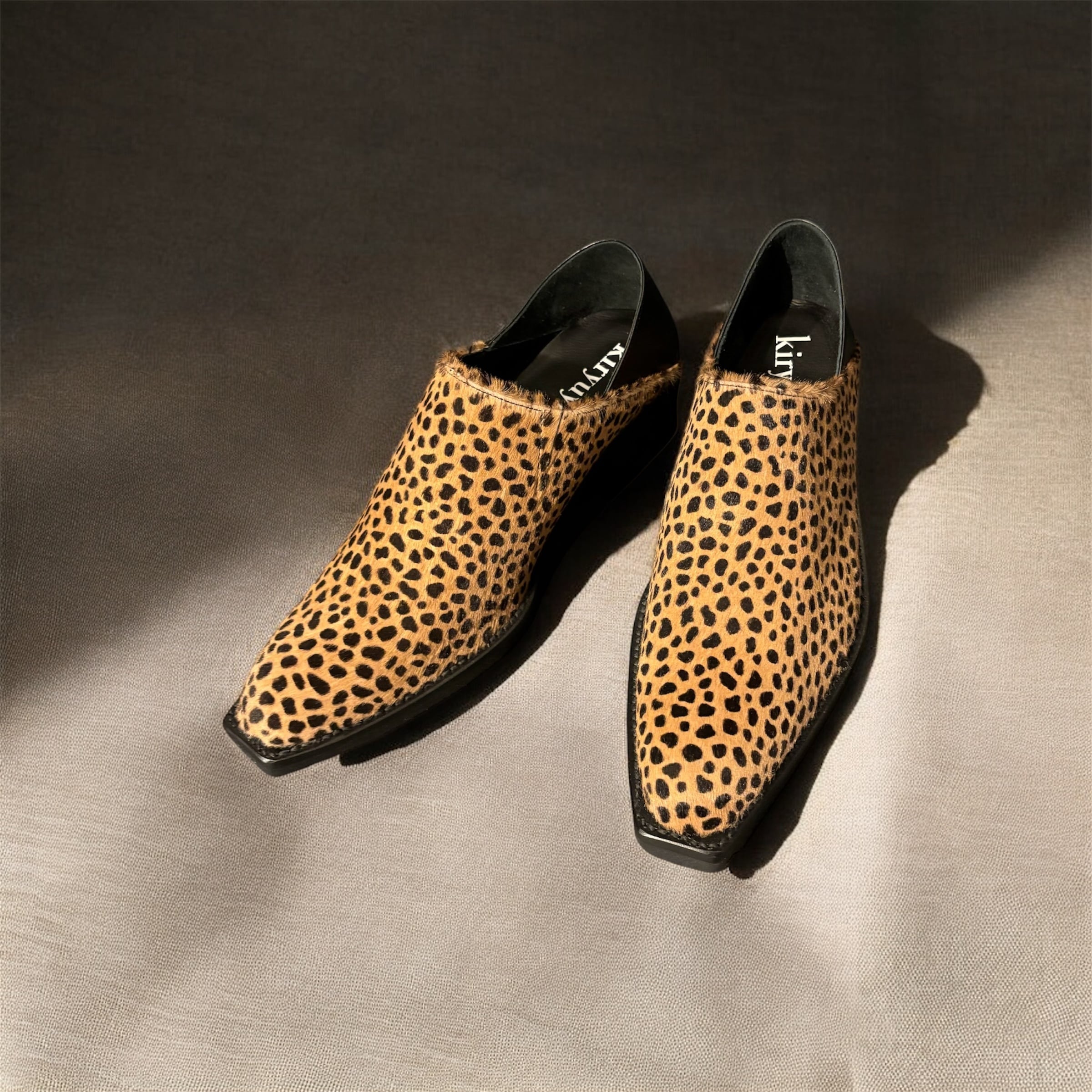 チーター柄ヘアーカーフレザーのミュール。