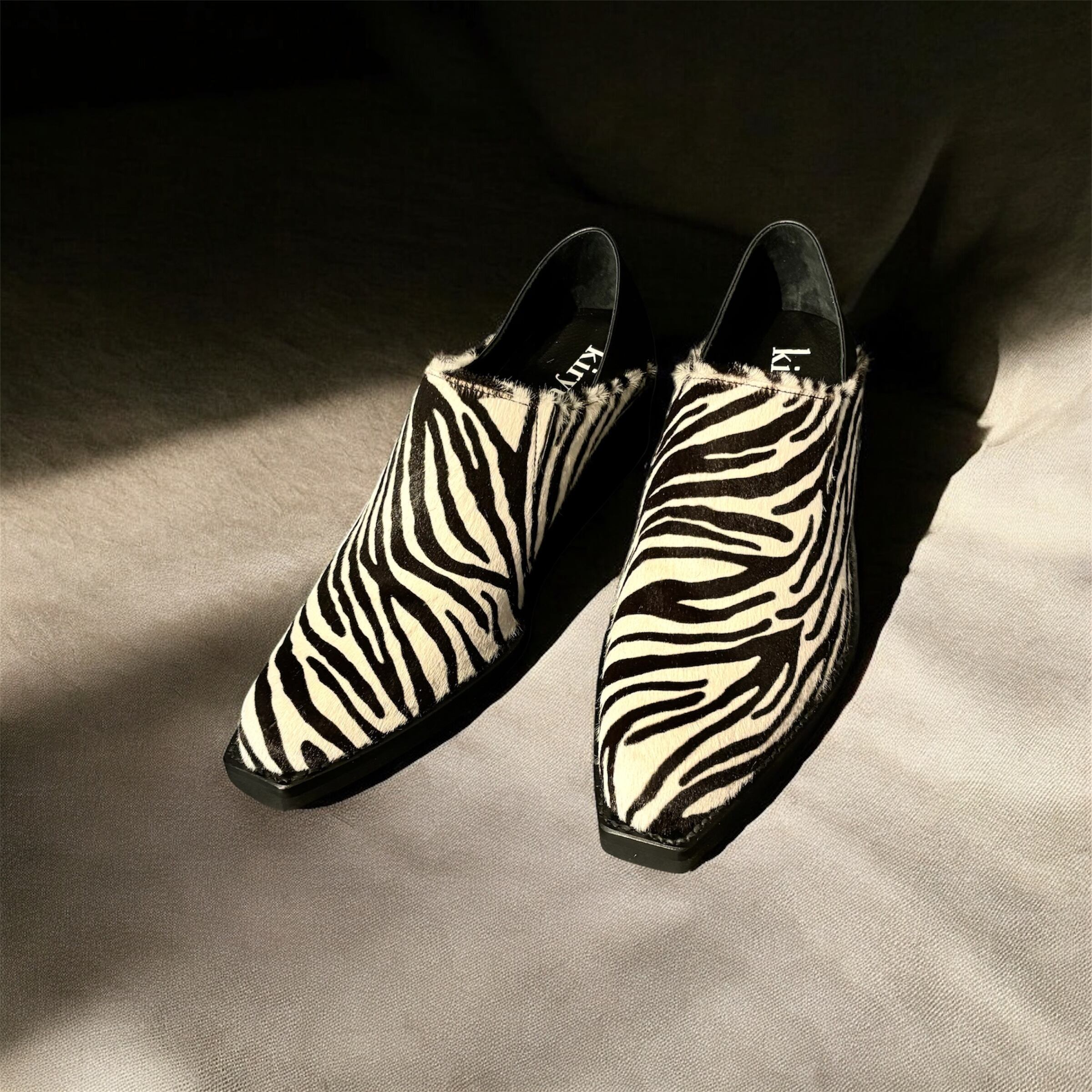 ゼブラ柄ヘアーカーフレザーのミュール。