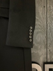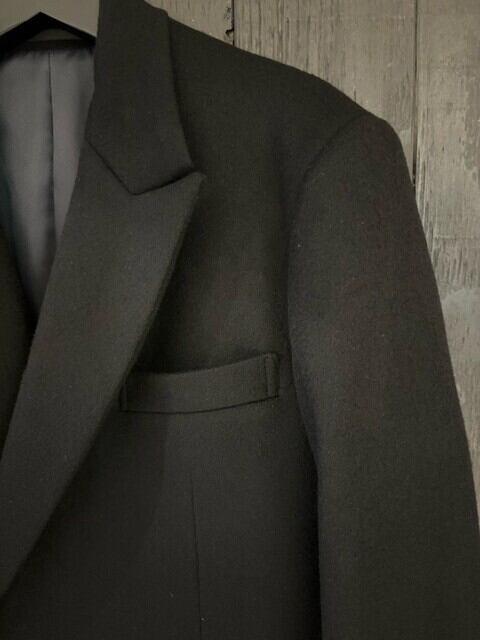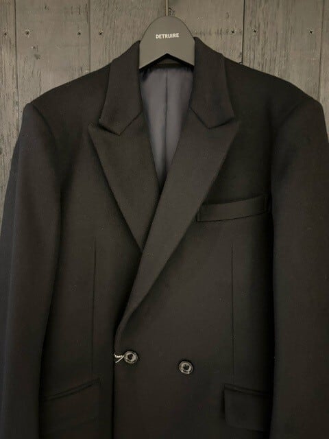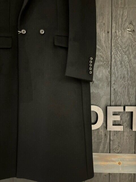 フロントはピークドラペルでオリジナルボタンのセミダブル。内側はお台場仕立てでシガーポケットを配置、袖は本切羽仕様の5つボタン、肩パッド入りのショルダーに襟ヒゲ・カラークロス仕様などクラシカルなテクニックで構築された最高級コート。
