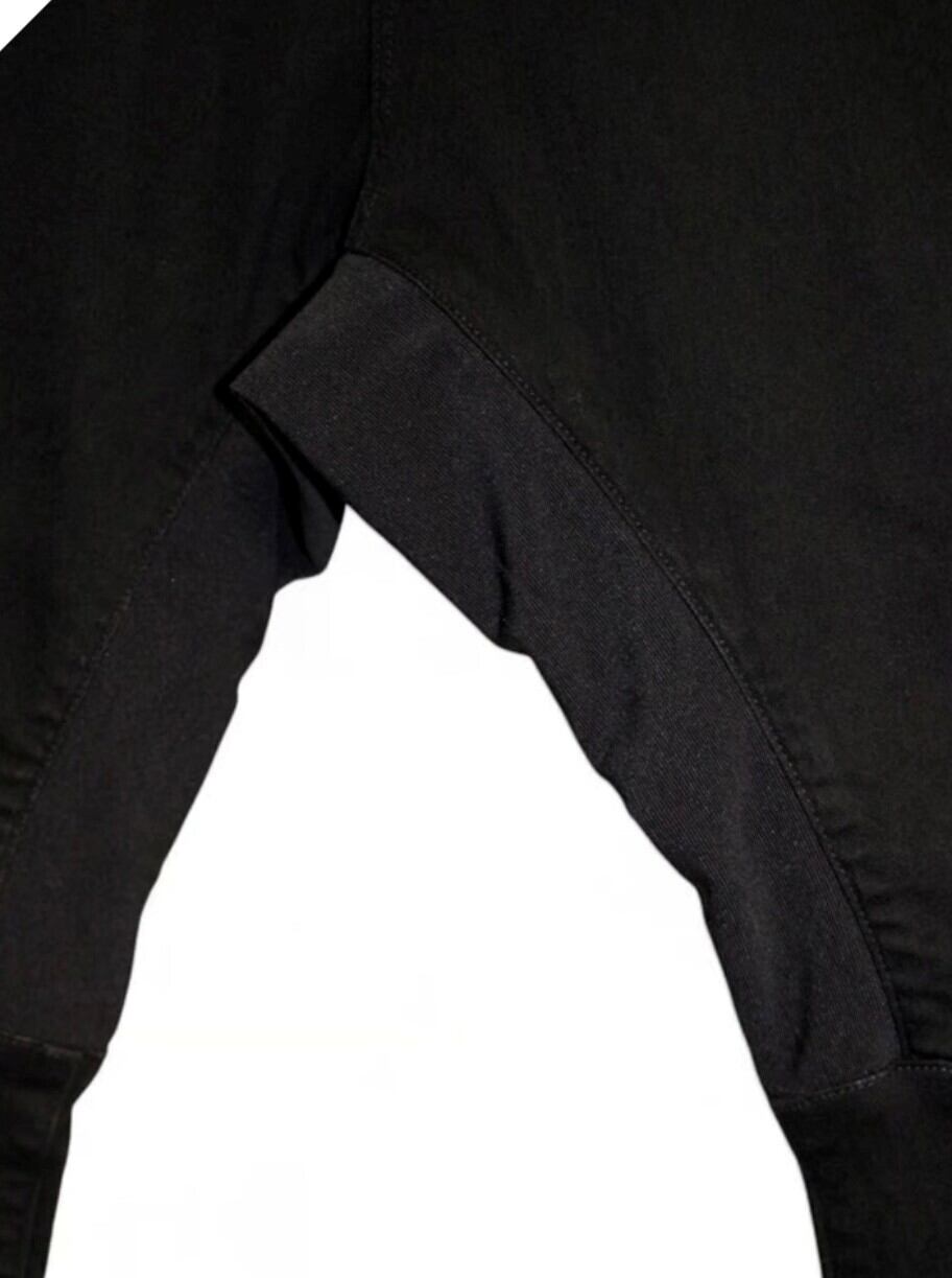 黒のポリエステルとポリウレタンを混紡した糸をスラブ糸で編みたててよりツヤ感のあるキックバックの強いハイブリッドなストレッチデニムに昇華しました。