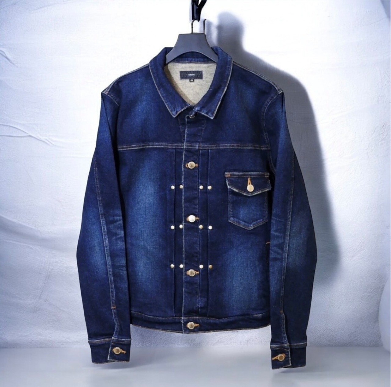 ■ Detail: 若干の光沢感あるデニム生地を使用したスーパーストレッチデニムを使用。タックを抑えたリベットをアクセントに洗練されたシルエットで構築。職人の手作業により丁寧にブラスト加工を施し自然な経年変化を表現したショートカラーのType-1タイプヴィンテージ風Gジャン