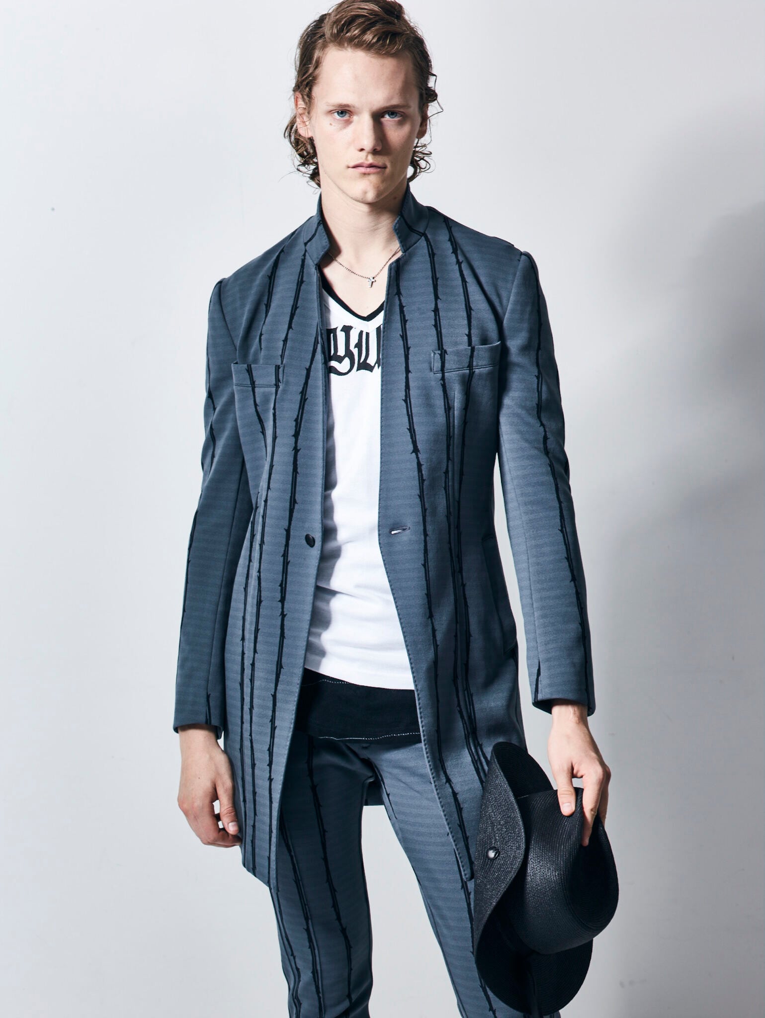 ストレッチが効いてて着やすいスタンドカラーロングジャケット.
