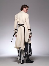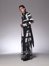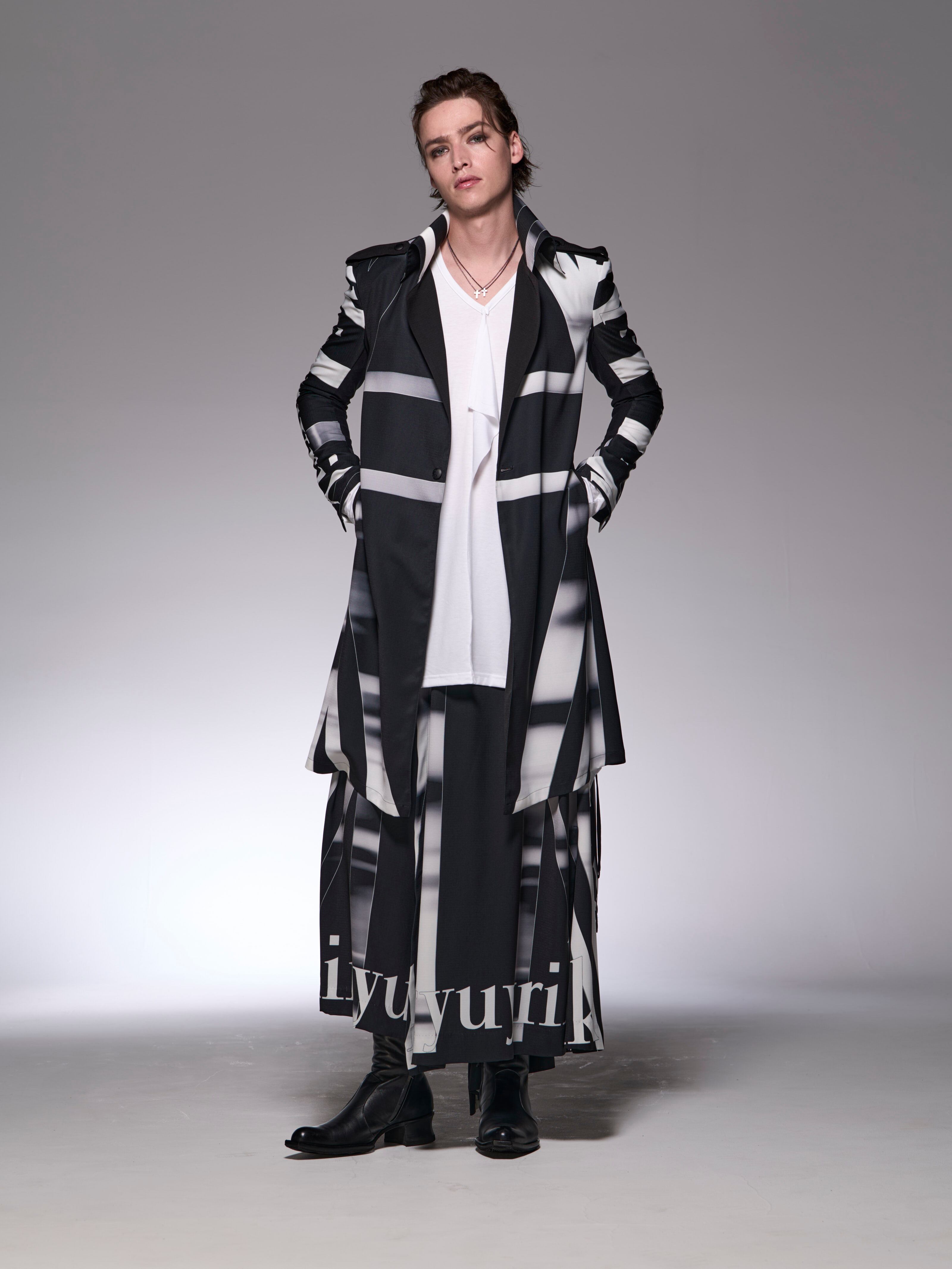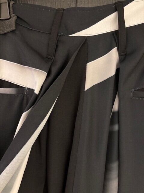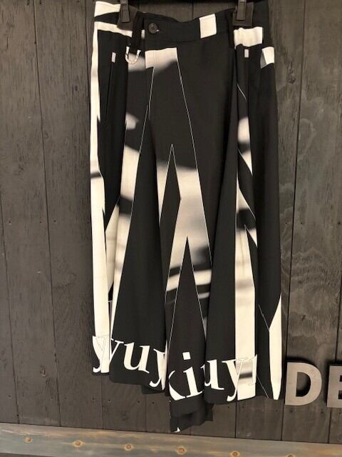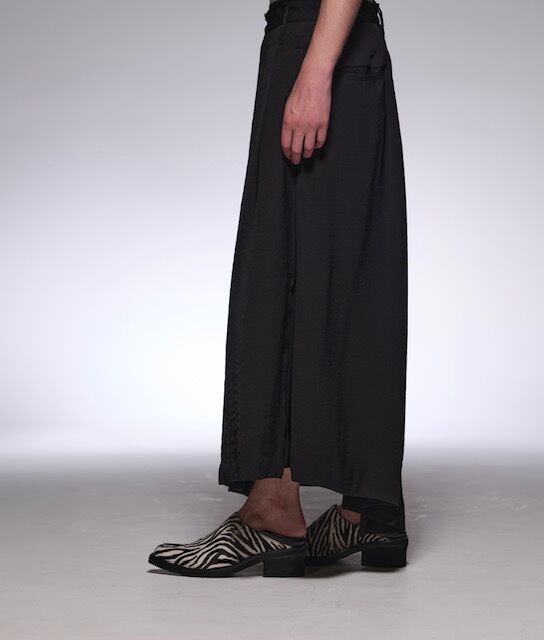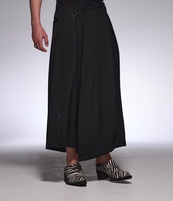 シャツ生地のスカート風腰当て付きワイドスラックス。