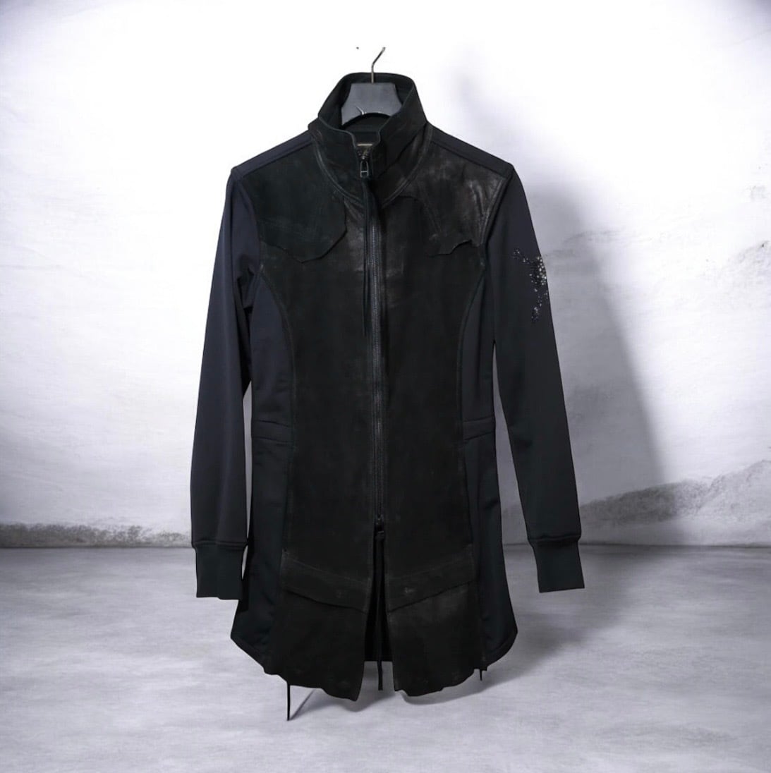 GOATレザーとジャージ素材によるコンビブルゾン。
