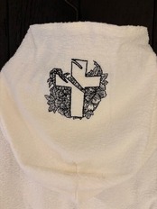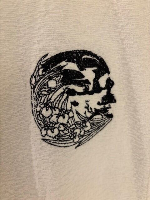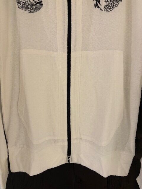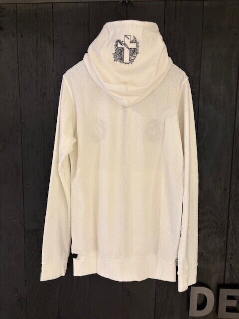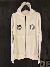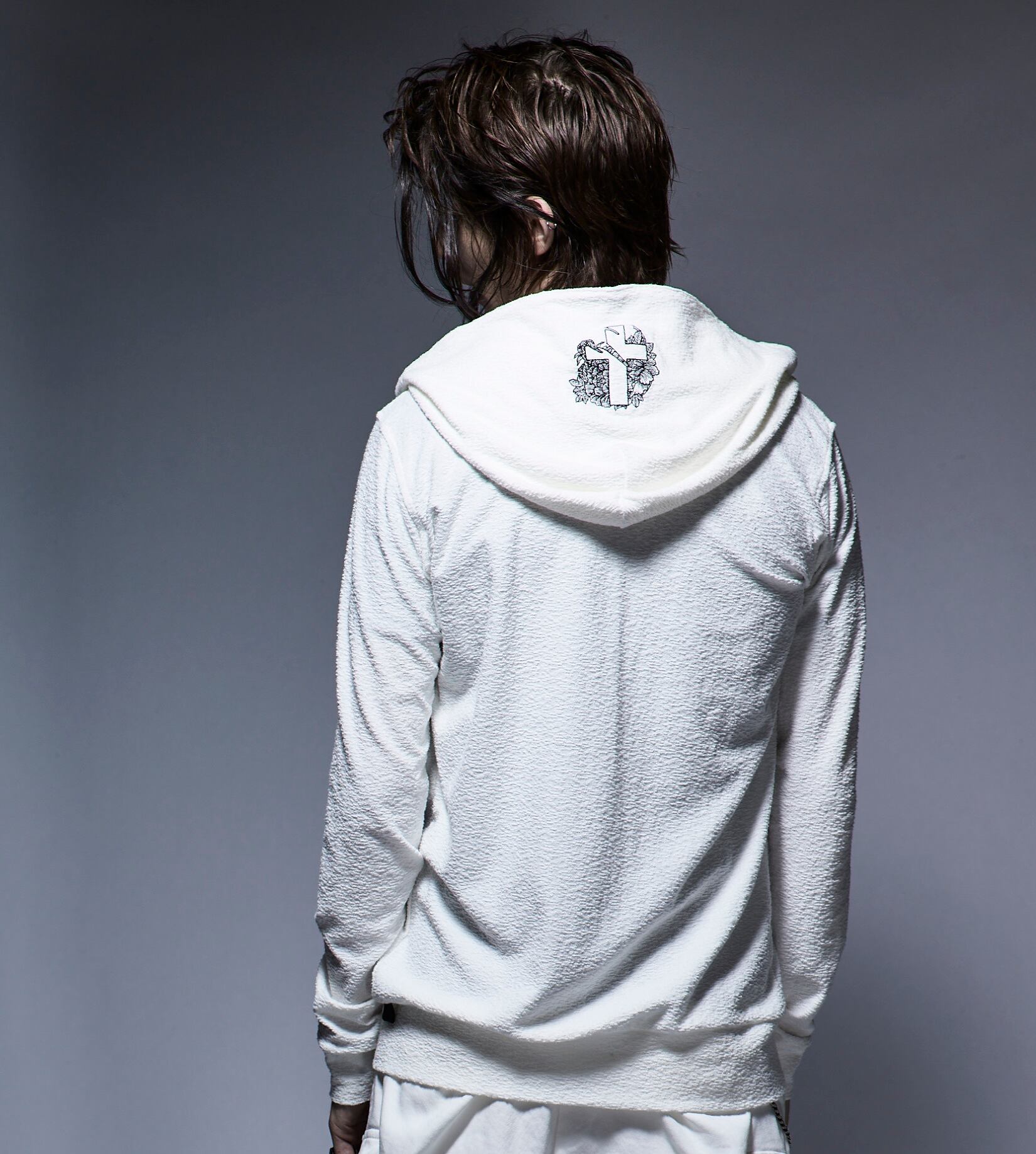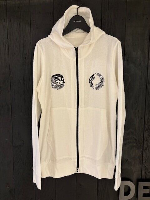 家紋風に刺繍した、パイル生地のパーカー。